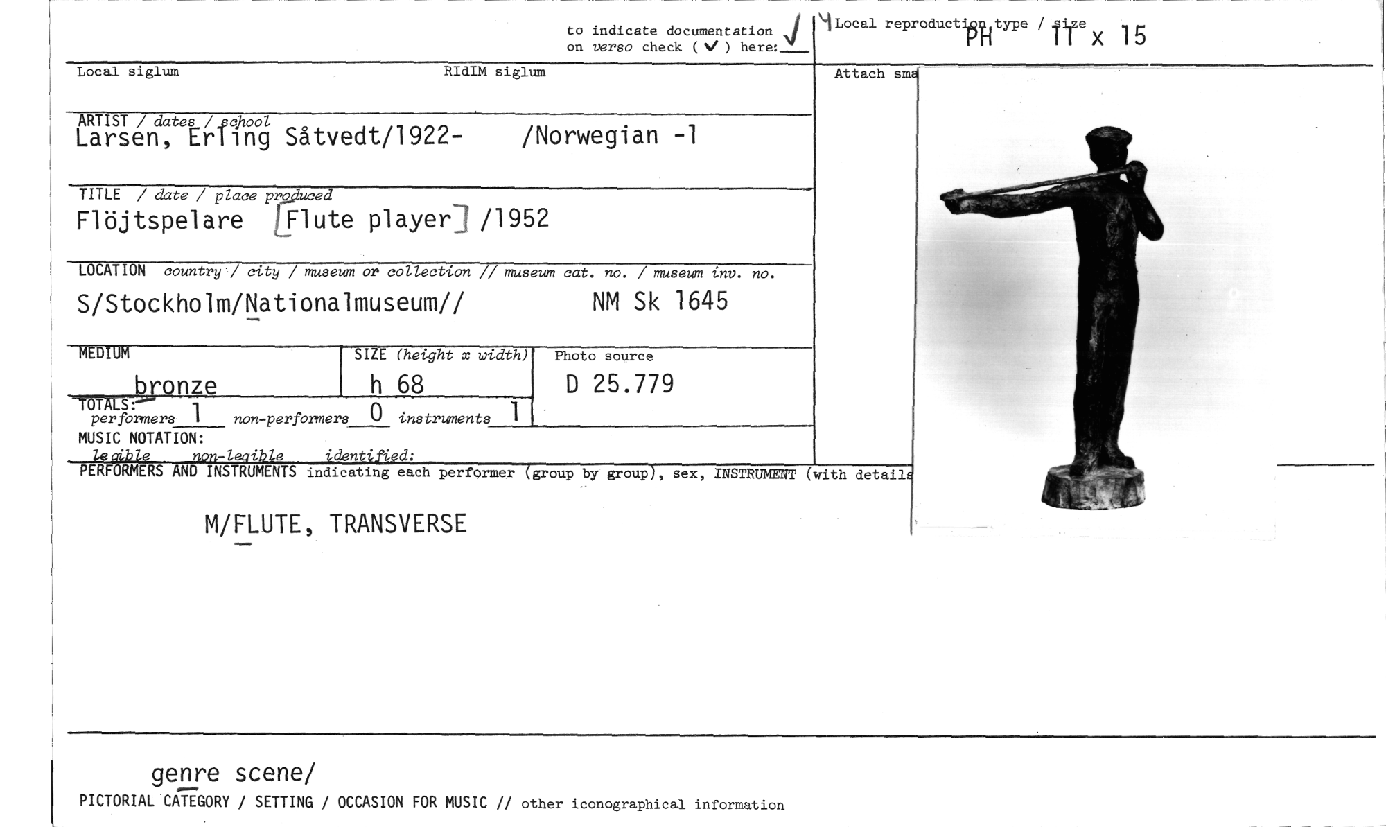//// Local reproductipfitype / fire x 1 5 //// to indicate documentation on versa check ( ) here:_ //// /Norwegian -1 //// ARTIST / dates /_sc.hool o //// Larsen, Erling Satvedt/1922- //// Local siglum RIdIM siglum //// TULE /dzte/placeprojuced //// Flöjtspelare LFlute player1 /1952 //// LOCATION country / city / museum or collection // museum cat. no. / museum tnv. no. //// S/Stockholm/Nationalmuseum// NM Sk 1645 //// MEDIUM //// T LS: //// per formers 1 non-performers 0 instruments //// MUSIC NOTATION: //// tecible non-lecible identified: //// PERFORMERS AND INSTRUMENTS indicating each performer (group by group), sex, INSTRUMENT //// M/FLUTE, TRANSVERSE //// Photo source //// D 25.779 //// Attach sme //// ith detailE //// genre scene/ //// PICTORIAL CATEGORY / SETTING / OCCASION FOR MUSIC // other iconographical information //// SIZE (height x width) //// h 68 ////