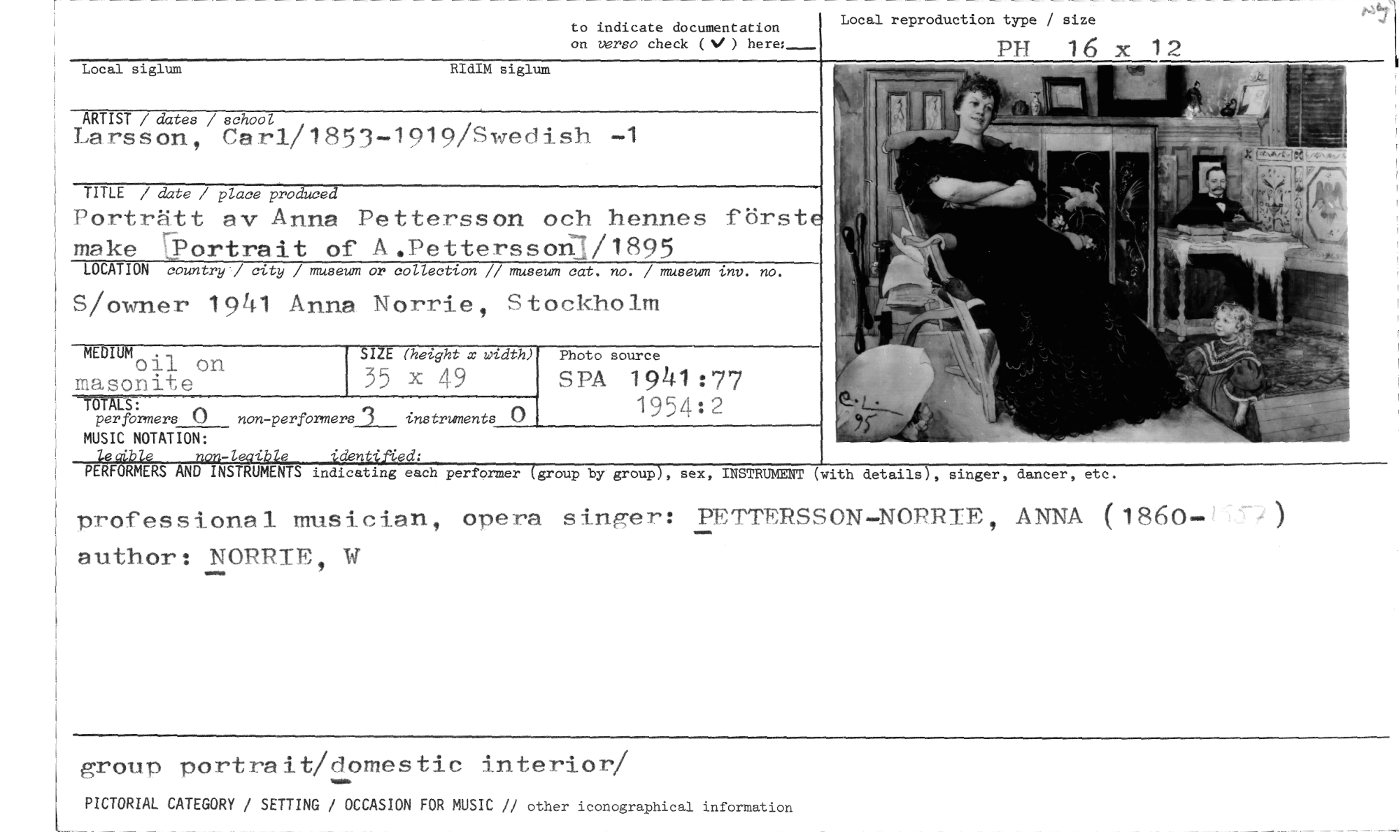 //// to indicate documentation Local reproduction type / size //// on verso check (V ) here; PH 16 x 12 //// TITLE / date / place produced //// Porträtt av Anna Pettersson och hennes förste //// make UPortrait of AsPetterssori1/1895 //// LOCATION country / city / museum or collection // museum cat. no. / museum inv. no. //// S/owner 1941 Anna Norrie, Stockholm //// SIZE (height x width) //// 35 x 49 //// professional musician, opera singer: PETTERSSON-NORRIE, ANNA (1860-, author: NORRIE, W //// Local siglum RIdIM siglum //// ARTIST / dates / school //// Larsson, Carl/1853-1919/Swedish -1 //// MEDIUMoil on masonite //// TOTALS: //// per formers () non-perfbrmers instruments () //// MUSIC NOTATION: //// lecible non-leaible identified; //// PERFORMERS AND INSTRUMENTS indicating each pertormer (group by groupT, sex, INSTRUMENT (with details), singer, danser, etc. //// Photo source //// SPA 1941:77 //// 1954:2 //// group portrait/domestic interior/ //// PICTORIAL CATEGORY / SETTING / OCCASION FOR MUSIC // other iconographical information //// L___ ////