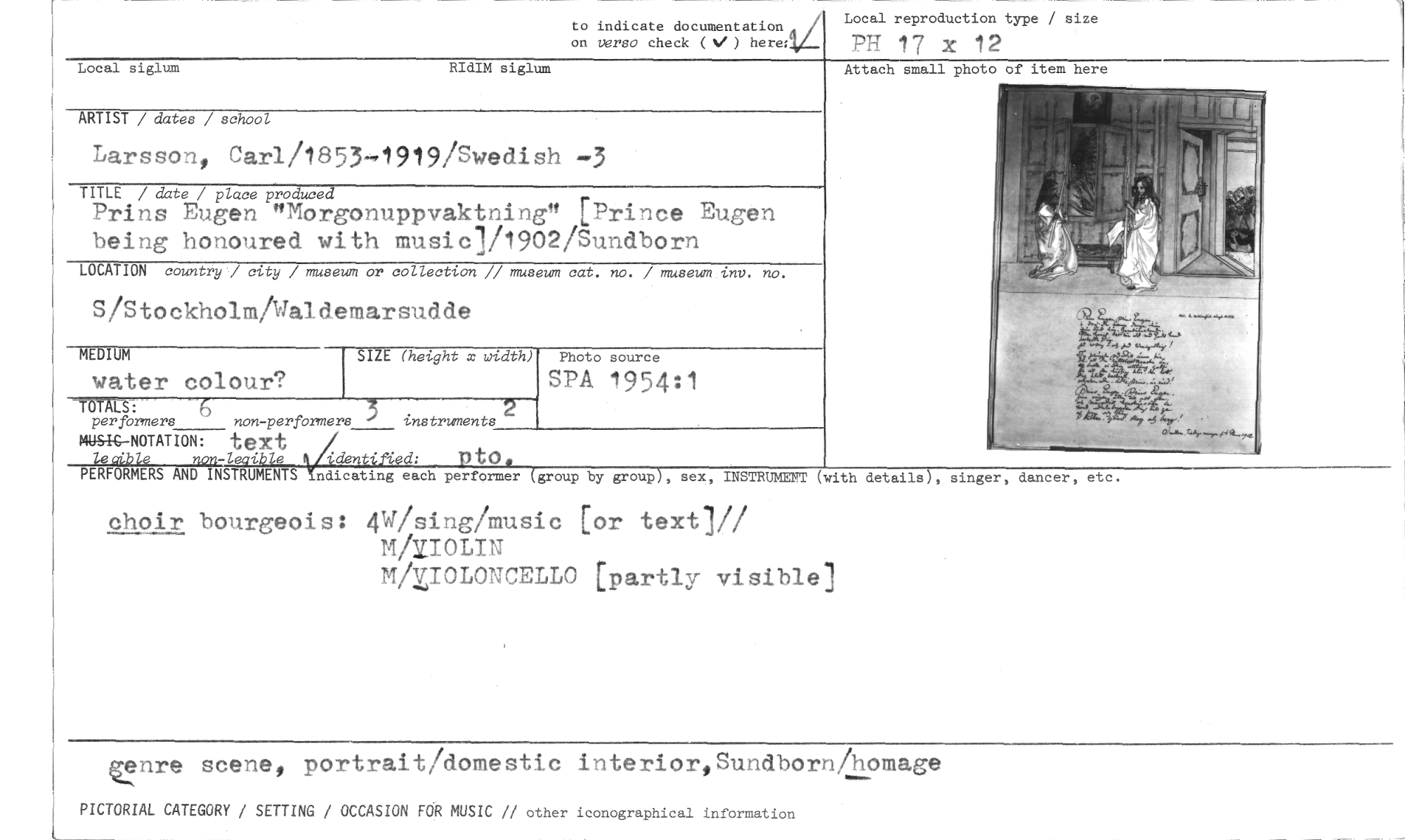 //// to indicate documentation //// Local reproduction type / size //// on versa check ( ) here: /—/ PH 17 x 12 //// Local siglum //// RIdIM siglum //// Attach small photo of i em here //// ARTIST / dates / school //// Larsson, Carl/1853-1919/Swedish -3 //// TITLE / date / place produced //// Prins Eugen "Morgonuppvaktning" [Prince Eugen being honoured with music1/1902/Sundborn //// LOCATION country / city / museum or collection /1 museum cat. no. / museum inv. no. //// S/Stockholm/Waldemarsudde //// MEDIUM //// water colour? //// SIZE (height x width) //// Photo source //// SPA 1954:1 //// per formers non-performers instruments //// -ramsT, 6 //// MUSIC NOTATION: text //// z i de //// PERFORMERS AND INSTRUMENT //// group by group , sex, INSTRUMENT (with deta ls , singer, dancer, etc. //// choir bourgeois: 4W/sing/music [or text]// //// M/YIOLIN //// MAIOLONCELLO [partly visible] //// genre scene, portrait/domestic interior,Sundborn/homage //// PICTORIAL CATEGORY / SETTING / OCCASION FOR MUSIC // other iconographical information ////