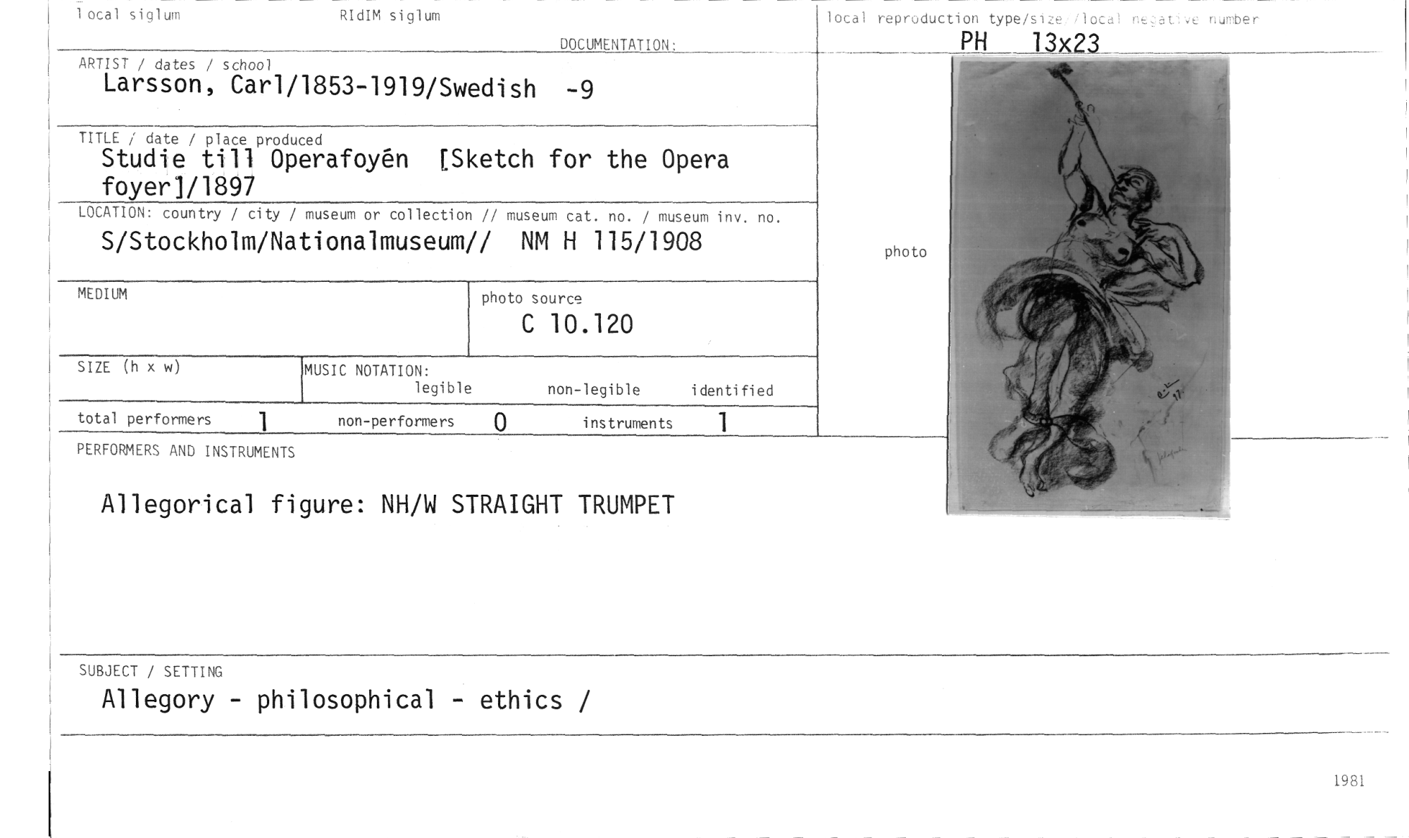 //// 1 ocal siglum RIdIM siglum //// DOCUMENTATION: //// lotal reproduction typei meat.e number //// PH 13x23 //// ARTIST / dates / school //// Larsson, Carl/1853-1919/Swedish -9 //// TITLE / date / place produced //// Studie till Operafoy&I [Sketch for the Opera //// foyer]/1897 //// LOCATION: country / city / museum or collection // museum cat. no. / museum inv. no. //// S/Stockholm/Nationalmuseum// NM H 115/1908 //// MEDIUM photo source //// C 10.120 //// SIZE (h x w MUSIC NOTATION: identified //// legible non-legible //// total performers 1 non-performers 0 instruments //// PERFORMERS AND INSTRUMENTS //// Allegorical figure: NH/W STRAIGHT TRUMPET //// SUBJECT / SETTING //// Allegory - philosophical - ethics / //// 1981 ////