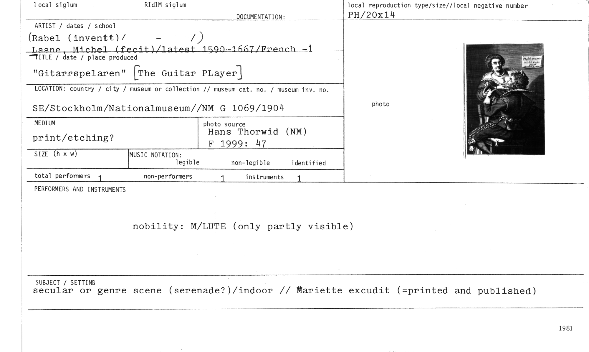 //// local siglum RIdIM siglum //// DOCUMENTATION: //// local reproduction type/size//local negative number //// PH/20x14 //// ARTIST / dates / school //// (Rabel (inventt)/ 1) //// Lasue Mirhp1 (fprit)/121-pg2t 159(1-1667/Fr.prioll —j //// / date / place produced //// "Gitarrspelaren" [The Guitar PLayer] //// LOCATION: country / city / museum or collection // museum cat. no. / museum inv. no. //// SE/Stockholm/Nationalmuseum//NM G 1069/1904 //// photo source //// Hans Thorwid (NM) F 1999: 47 //// SIZE (h x w) //// non-legible identified //// total performers 1 non-performers 1 instruments 1 //// print/etching? //// MEDIUM //// MUSIC NOTATION: //// legible //// photo //// PERFORMERS AND INSTRUMENTS //// nobility: M/LUTE (only partly visible) //// SUBJECT / SETTING //// secular or genre scene (serenade?)/indoor // Mariette excudit (=printed and published) //// 1981 ////