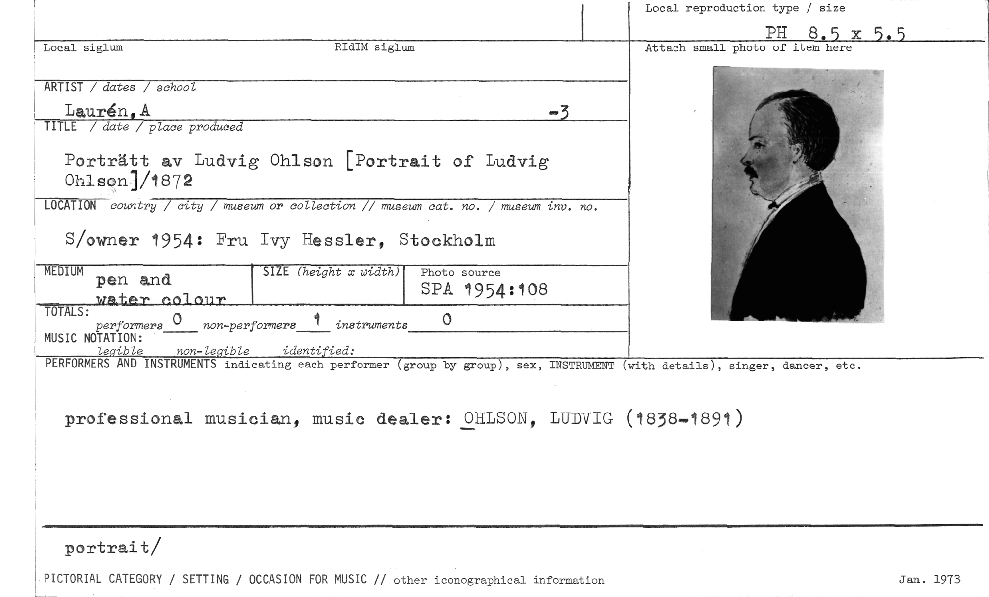 //// professional musician, music degler: OHLSON, LUDVIG (1838-1891) //// portrait/ //// PICTORIAL CATEGORY / SETTING / OCCASION FOR MUSIC // other iconographical information Jan. 1973 //// Local siglum RIdIM siglum //// -3 //// Laurdn,A //// MEDIUM //// pen and watfur nn1 mur //// TOTÄLS : //// performers non-performers 1 instruments 0 //// MUSIC NOTATION: //// Legible non-legible identified: //// PERFORMERS AND INSTRUMENTS indicating each performer (group by group), sex, INSTRUMENT (with details), singer, dancer, etc. //// Photo source //// SPA 1954:108 //// SIZE (height x width) //// Local reproduction type / size //// PH 8.5 x 5.5 //// ARTIST / dates / school //// TITLE / date / place produced //// Porträtt av Ludvig Ohlson [Portrait of Ludvig Ohlson]/1872 //// LOCATION country / city / museum or collection // museum cat. no. / museum ina. no. //// S/owner 1954: Fru Ivy Hessler, Stockholm //// Attach small photo of item here ////