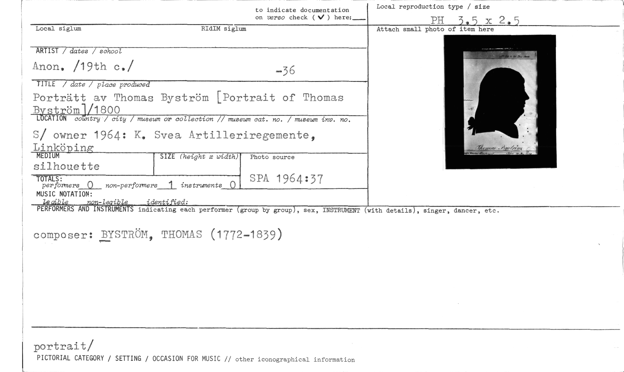 //// to indicate documentation //// on verso check (%, ) here:___ //// Local reproduction type / size //// PH 3.5 x 2.5 //// Attach small photo of item here //// Local siglum RIdIM siglum //// ARTIST / dates / school //// Anon, /19th c./ —36 //// TITLE / date / place produced //// Porträtt av Thomas Byström [Portrait of Thomas Byström]/1800 //// LOCATION countryj city / museum or collection // museum cat. no. / museum inv. no. //// S/ owner 1964: K. Svea Artilleriregemente, //// Linköping //// MEDIUM SIZE (height x width) //// silhouette //// //// //// Photo source //// SPA 1964:37 //// -TOTALS: //// per formers 0 non-performers___1_ instruments 0 //// MUSIC NOTATION: //// 194ble non-leaible identified: //// PERFORMERS AND INSTRUMENTS indicating each performer (group by group), sex, INSTRUMENT (with details), singer, dancer, etc. //// composer: BYSTRÖM, THOMAS (1772-1839) //// portrait/ //// PICTORIAL CATEGORY / SETTING / OCCASION FOR MUSIC // other iconographical information ////