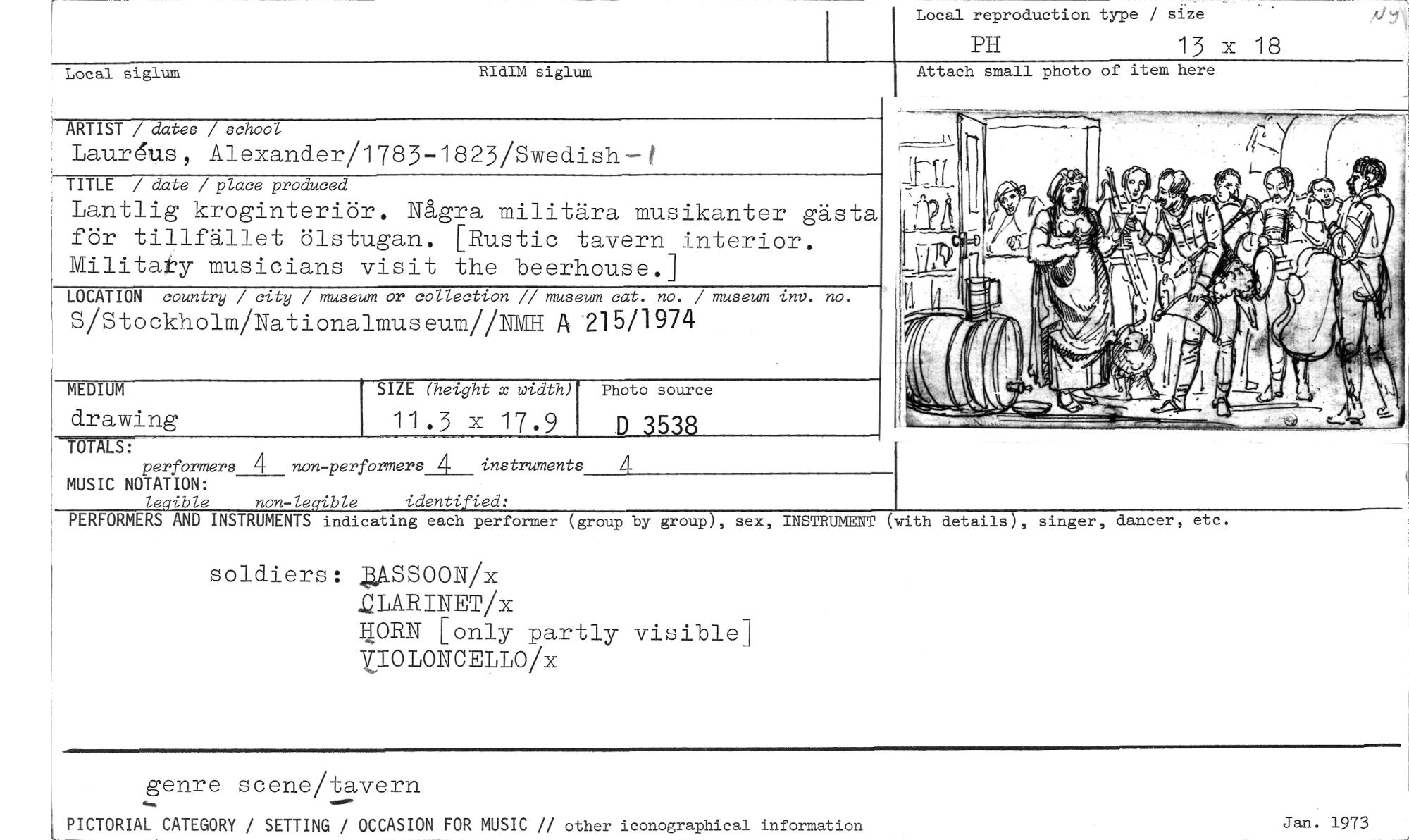 //// Local reproduction type / size //// PH 13 x 18 //// RIdIM siglum Attach small photo of item here //// ARTIST / dates / school //// Laurgus , Alexander/1783-1823/Swedish — i //// TITLE / date / place produced //// Lantlig kroginteriör. Några militära musikanter gästa för tillfället ölstugan. [Rustic tavern interior. Militaky musicians visit the beerhouse.] //// LOCATION country / city / museum or collection // museum cat. no. / museum 1..nv. no. //// S/S t o ckholm/Nat i onalmus eum//N11/11 A 215/1974 //// SIZE (height x width) Photo source //// 1 //// TOTA //// perförmers 4 non-performers 4 instruments 4 //// MUSIC NOTATION: //// leöible non -leqible identified: //// PERFORMERS AND INSTRUMENTS indicating each performer (group by group), sex, INSTRUMENT (with details), singer, dancer, etc. //// soldiers: JUSSOON/x //// 2LARINET/x //// DORN [only partly visible] UOLONCELLO/x //// Local siglum //// MEDIUM //// drawing //// genre scene/tavern //// PICTORIAL CATEGORY / SETTING OCCASION FOR MUSIC // other iconographical information //// Jan. 1973 ////