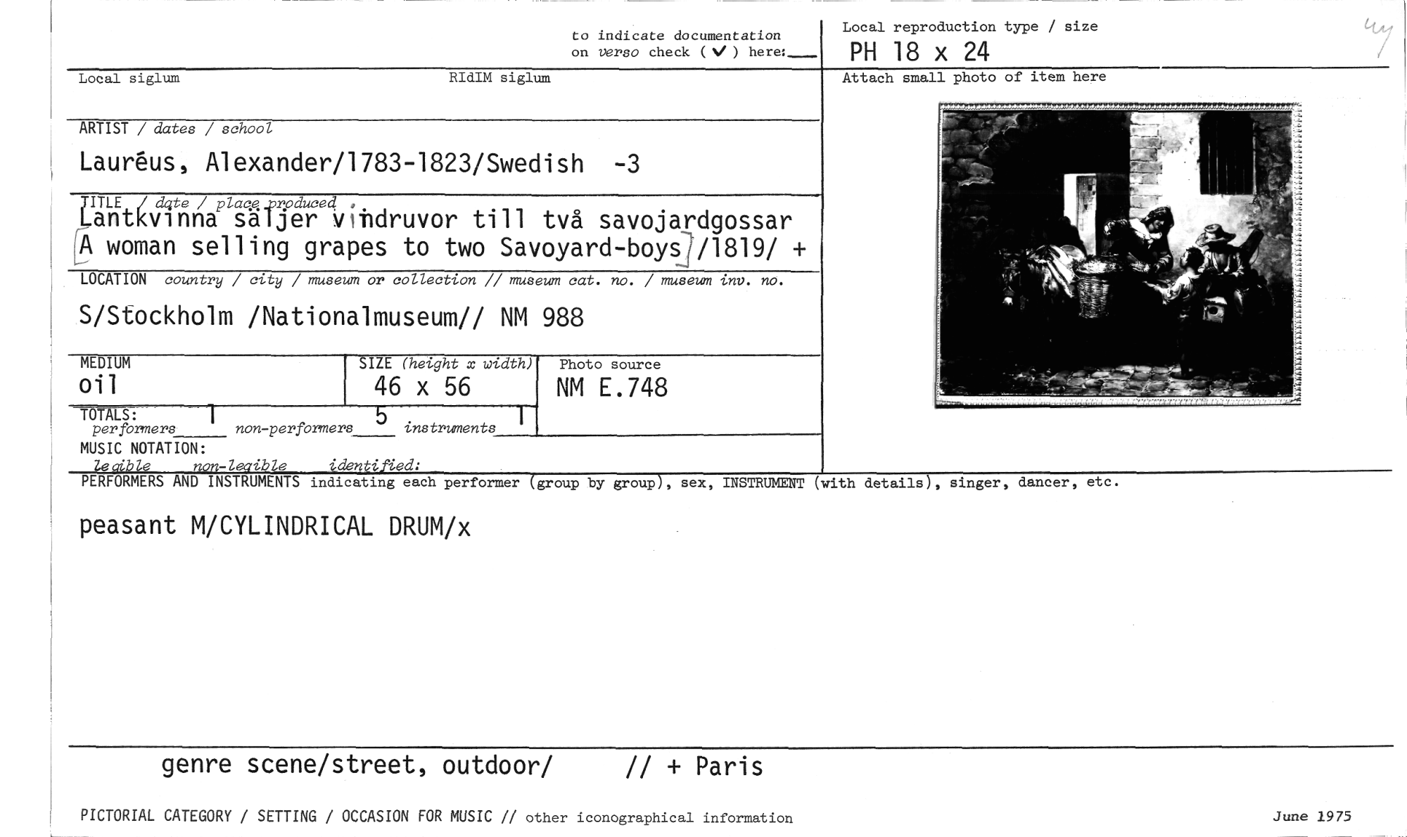 //// to indicate documentation //// on verso check ( / ) here:_ //// Local reproduction type / size //// PH 18 x 24 //// Attach small photo of item here //// Local siglum RIdIM siglum //// ARTIST / dates / school //// Laurhs, Alexander/1783-1823/Swedish -3 //// JITLE / dqte / plaqq_pnoduced ). //// Lantkvinna saljer vindruvor till två savojardgossar (A woman selling grapes to two Savoyard-boys /1819/ + //// LOCATION country / city / museum or collection // museum cat. no. / museum -ulv. no. //// S/Stockholm /Nationalmuseum// NM 988 //// MEDIUM //// oil //// SIZE (height x width) //// 46 x 56 //// Photo source //// NM E.748 //// TOTA/ //// per formers I non-performers 5 instruments i //// MUSIC NOTATION: //// leaible non-leaible //// PERFORMERS AND INSTRUMENTS //// indicating each performer (group by group), sex, INSTRUMENT (with details), singer, dancer, etc. //// peasant M/CYLINDRICAL DRUM/x //// genre scene/street, outdoor/ // + Paris //// PICTORIAL CATEGORY / SETTING / OCCASION FOR MUSIC // other iconographical information //// inne 1975 ////
