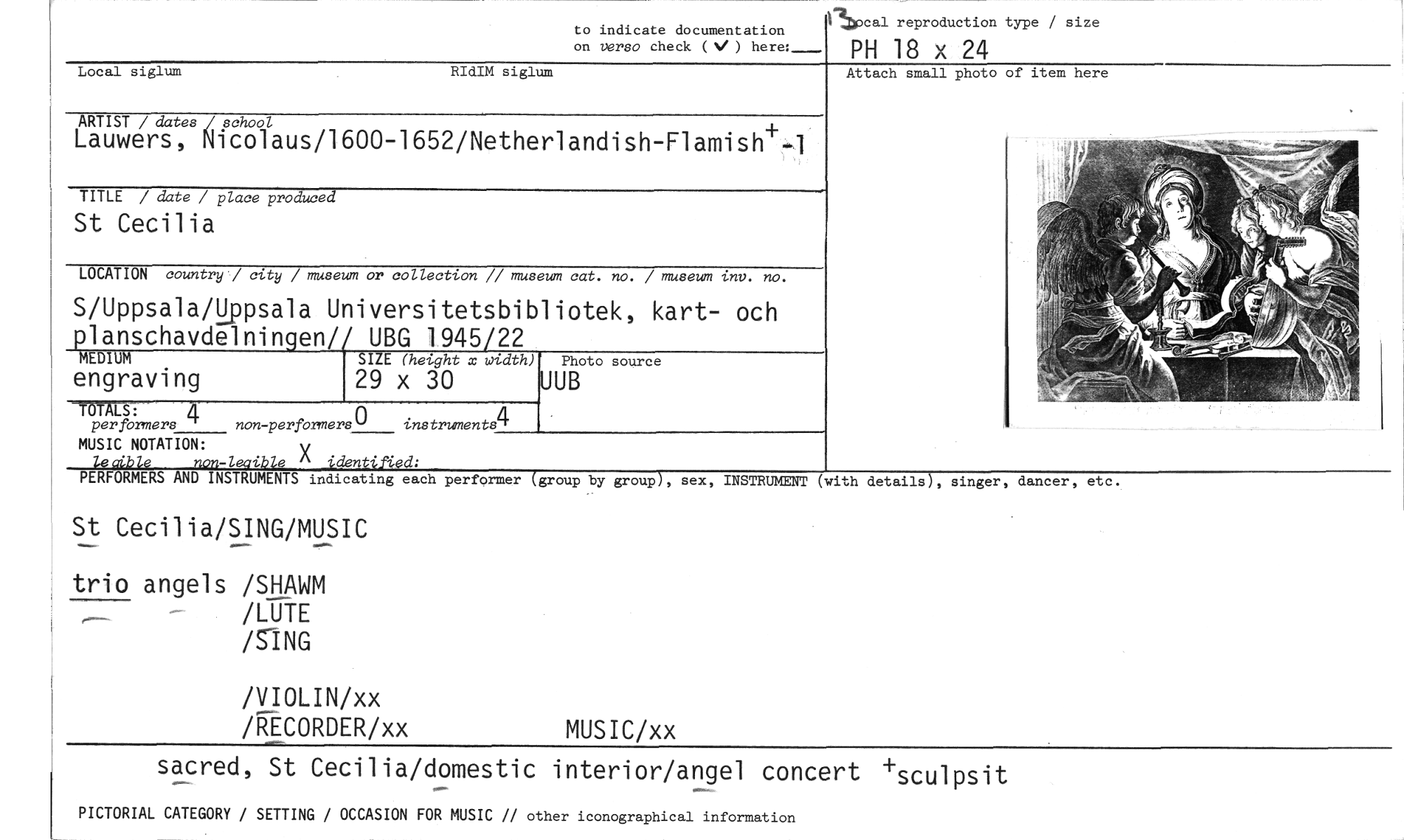 //// to indicate documentation //// on verso check (V ) here:- //// 112pcal reproduction type / size //// PH 18 x 24 //// Local siglum RIdIM siglum //// ARTIST / dates / school //// Lauwers, Nicolaus/1600-1652/Netherlandish-Flamish+-1 //// TITLE / date / place produced //// St Cecilia //// LOCATION country / city / museum or collection // museum cat. no. / museum inv. no. //// S/Uppsalaappsala Universitetsbibliotek, kart- och //// planschavdelningen// UBG 1945/22 //// MEDIUM SIZE (height x width) Photo source //// engraving 29 x 30 UUB //// A tach small photo of item here //// TÖTALS: //// per formers 4 non-perfamers° instruments //// MUSIC NOTATION: //// tecible non-leoible X identif4ed; //// PERFORMERS AND INSTRUMENTS indicating each //// performer (group by group), sex, INSTRUMENT (with details), singer, dancer, //// etc. //// St Cecilia/SING/MUSIC //// trio angels /SHAWM //// ILUtE //// /SING //// /VIOLIN/xx /RECORDER/xx //// MUSIC/xx //// //// sacred, St Cecilia/domestic interior/angel concert +sculpsit //// PICTORIAL CATEGORY / SETTING / OCCASION FOR MUSIC // other iconographical information ////