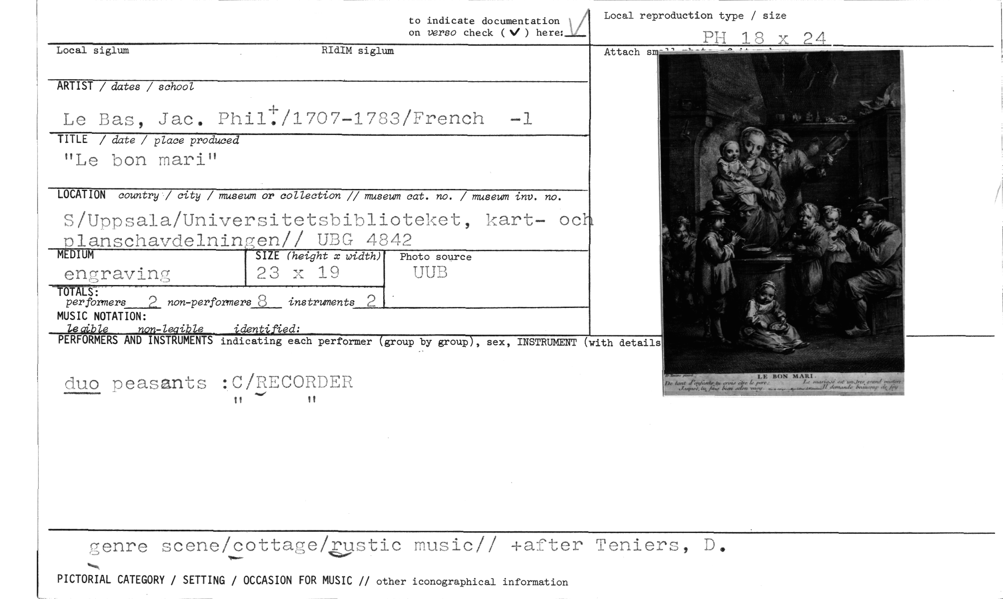 //// to indicate documentation on uarso check (N/ ) here: //// Local siglum RIdIM siglum //// ARTIST / datea / school //// +, //// Le Bas. Jac. Phil./1707-1783/French -i //// TITLE / date / place produced //// "Le bon mari" //// LOCATION country '/ city / museum or collection // museum cat. no. / museum inv. no. //// S/Uppsala/Universitetsbiblioteket, kart- oc //// planschavdelningen// UBG 4842 //// p //// mE IUM SIZE (height x width) Photo source //// engraving 23 x 19 UUB Local reproduction type / size //// Attach s //// TOTALS: //// perforners___2_ non-performers 8 instruments //// MUSIC NOTATION: //// 194ble non-leaible identified: //// PERFORMERS AND INSTRUMENTS indicating each performer (group by group], sex, INSTRUMENT (with details //// duo oeasants :C/RECORDER //// genre scene/cottage/rustic music// +after Teniers, D. ,,, //// s, //// PICTORIAL CATEGORY / SETTING / OCCASION FOR MUSIC // other iconographical information ////