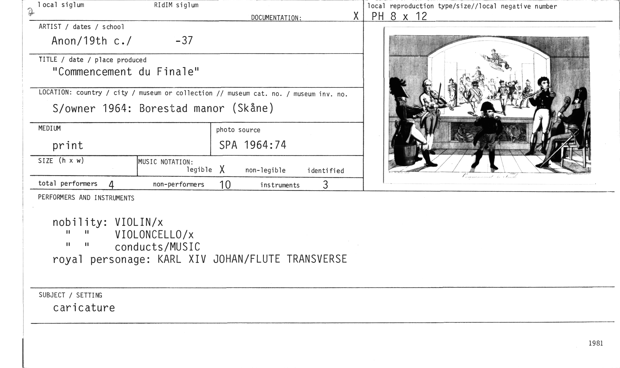 //// 1 ocal siglum RIdIM siglum //// DOCUMENTATION. //// local reproduction type/size//local negative number //// PH 8 x 12 //// ARTIST / dates / school //// Anon/19th c./ -37 //// TITLE / date / place produced //// "Commencement du Finalen //// LOCATION: country / city / museum or collection // museum cat. no. / museum inv. no. //// MEDIUM //// print //// SIZE (h x w) //// total performers 4 non-performers 10 //// S/owner 1964: Borestad manor (Skåne) //// MUSIC NOTATION: //// legible X non-legible identified //// photo source //// SPA 1964:74 //// instruments //// 3 //// PERFORMERS AND INSTRUMENTS //// nobility: VIOLIN/x //// " " VIOLONCELLO/x //// " " conducts/MUSIC //// royal personage: KARL XIV JOHAN/FLUTE TRANSVERSE //// SUBJECT / SETTING //// caricature //// 1981 ////