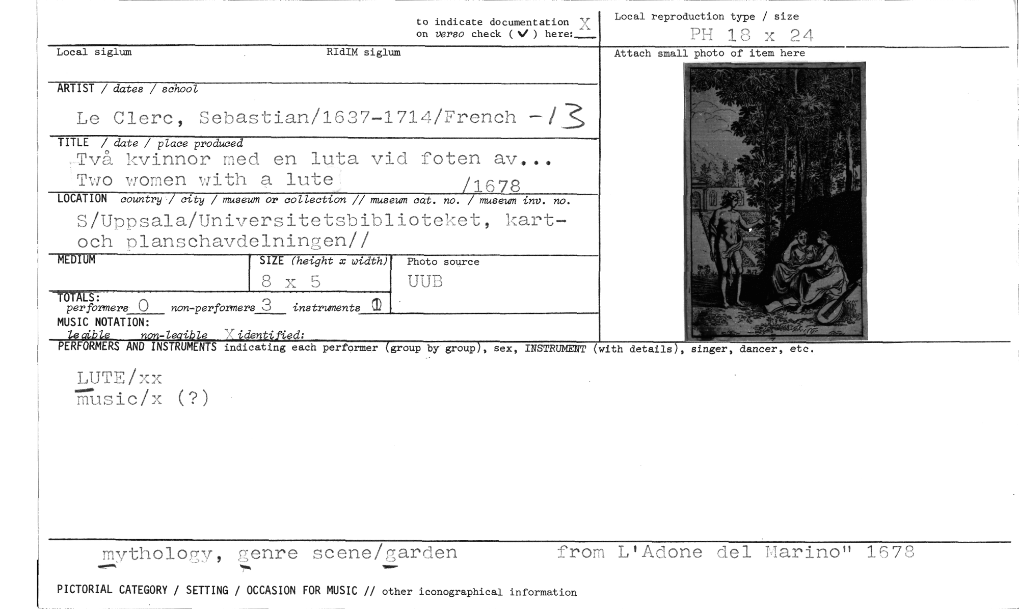 //// to indicate documentation X on verso check (V ) //// Local reproduction type / size //// PH 18 x 24 //// Local siglum RIdIM siglum //// Attach small photo of item here //// (with details), singer, dancer, etc. //// ARTIST / dates / school //// Le Clerc, Sebastian/1637-1714/French //// TITLE /date/placeproShoed //// ,Två kvinnor med en luta vid foten av... Tero veomen with a lute. /1678 //// LOCATION country'/ city / museum or collection // museum cat. no. / museum inv. no. //// S/Uppsala/Universitetsbiblioteket, kart - och planschavdelningen// //// MEDIUM SIZE (height x width) Photo source //// 8 x 5 UUB //// ?OTALS: //// per formers 0 non-perforners 3 instruments CD //// MUSIC NOTATION: //// 144ble non-leaible Xidentifted: //// PERFORMERS AND INSTRUMENTS indicating each performer (group by group), sex, INSTRUMENT //// LUTE/xx //// ^^ //// music/x (?) //// mythology, genre scene/garden from L'Adone del Marino" 1678 //// PICTORIAL CATEGORY / SETTING / OCCASION FOR MUSIC // other iconographical information ////