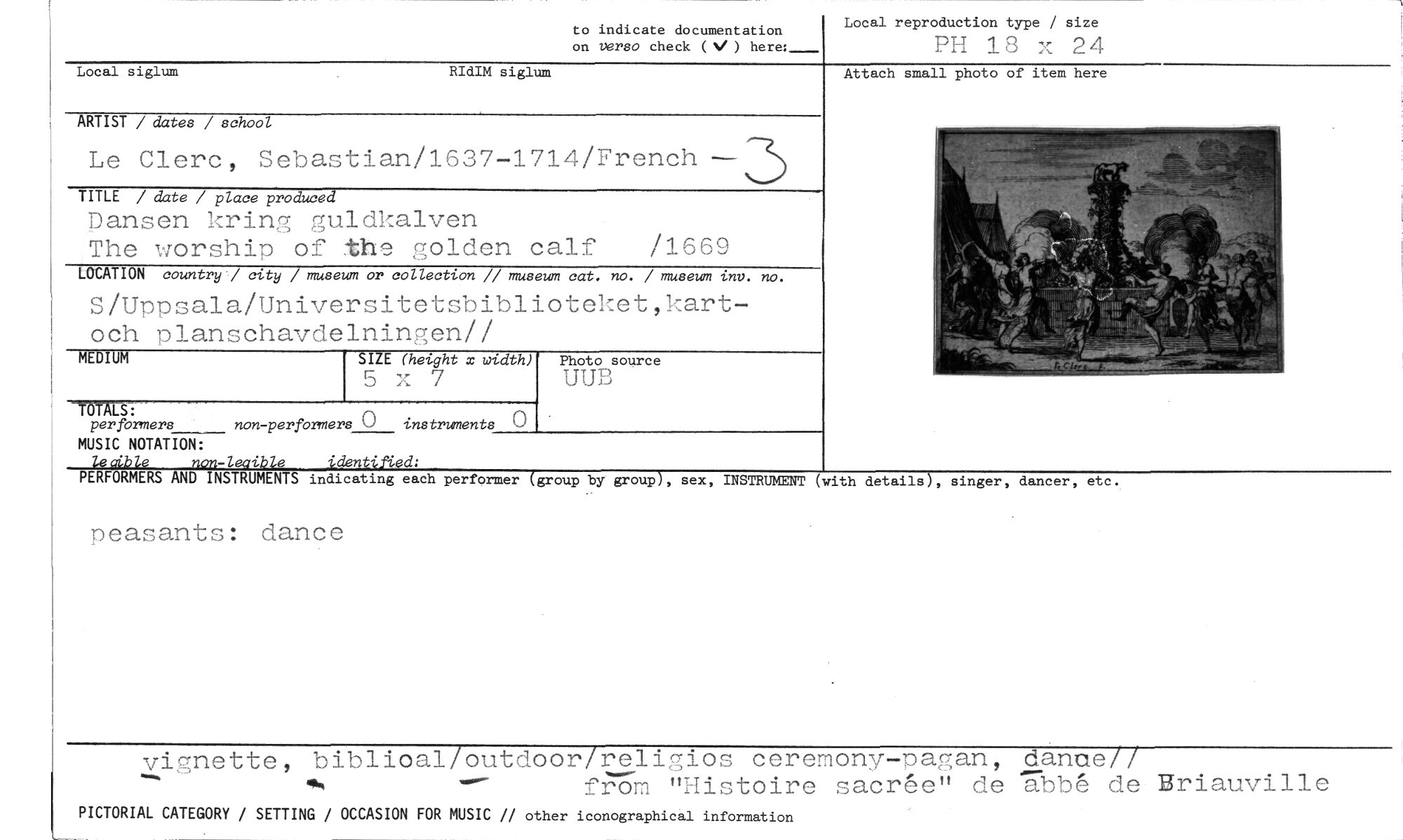 //// to indicate documentation //// on verso check (V ) here: //// Local reproduction type / size //// PI-1 18 x 24 //// ARTIST / dates / school //// Le Clerc, Sebastian/1637-1714/French //// TITLE / date / place produced //// pansen kring guldkalven //// The worship of the golden calf /1669 //// LOCATION country / city / museum or collection // museum cat. no. / museum inv. no. //// S/Uppsala/Universitetsbiblioteket,kartoch planschavdelningen// //// SIZE (height x width) //// 5 x 7 //// MEDIUM //// photo source //// UUB //// Attach small photo of item here //// Local siglum //// RIdIM siglum //// -MÄLS: //// .) //// per formers non-performers 0 instrzonents //// MUSIC NOTATION: //// non-leaible identified: //// PERFORMERS AND INSTRUMENTS indicating each performer (group by group), sex, INSTRUMENT (with details), singer, dancer, etc. //// peasants: dance //// vignette, biblioal/outdoor/religios ceremony-pagan, danue// - //// fT7'"ö'm "Histoire sacr6e" de -gbb6 de Briauville //// PICTORIAL CATEGORY / SETTING / OCCASION FOR MUSIC // other iconographical information ////