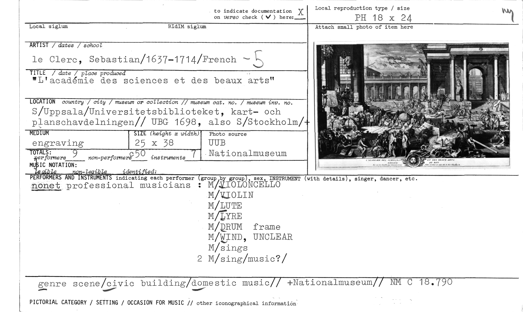 //// to indicate documentation //// on versa check (N/ ) here:___- //// Local reproduction type / size //// PH 18 x 24 //// Local siglum RIdIM siglum //// ARTIST / dates / school //// le Clerc, Sebastian/1637-1714/French //// TITLE / date / place produced //// "L'acad4mie des sciences et des beaux arts" //// LOCATION country / city / museum or collection // museum cat. no. / museum inv. no. //// S/Uppsala/Universitetsbiblioteket, kart— och planschavdelningen// UBG 1698, also S/Stockholm/+ //// MEDIUM SIZE (height x width) Photo source //// engraving 25 x 38 UUB Nationalmuseum //// -OTALS: 9 non-performer 50 i 7 //// lerformers s nstruments //// MUSIC NOTATION: //// non-lecible identified: //// PERFORMERS AND INSTRUMENTS indicating each performer (group by group), sex INSTRUMENT //// nonet professional musicians M/ZEOLONCEfLO //// M/XIOLIN //// M/LUTE //// M/DRE //// M/DRUM frame M/UND, UNCLEAR M/sings //// 2 M/sing/music?/ //// At ach small photo of item here //// (with details), singer, dancer, etc. //// genre scene/civic building/domestic music// +Nationalmuseum// NM C 18.790 //// PICTORIAL CATEGORY / SETTING / OCCASION FOR MUSIC // other iconographical information ////