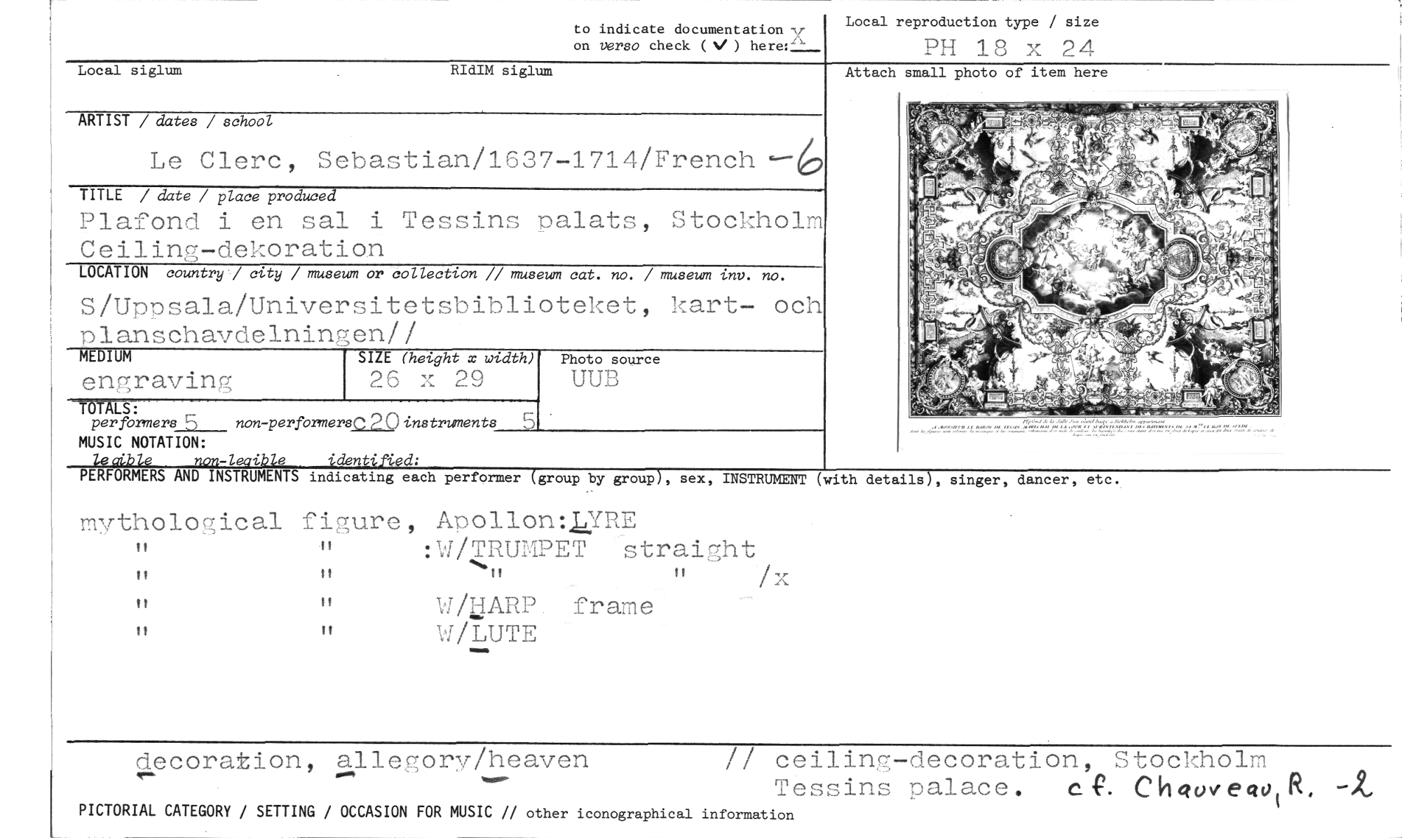//// to indicate documentation //// Local reproduction type / size //// -sr //// on verso check (N) here:._ PH 18 X 24 //// Local siglum RIdIM siglum //// ARTIST / dates / school //// Le Clerc, Sebastian/1637-1714/French //// TITLE / date / place produced //// Plafond i en sal i Tessins palats, Stockholm //// Ceiling -dekoration //// LOCATION country / city / museum or collection // museum cat. no. / museum inv. no. //// S/Uppsala/Universitetsbiblioteket, kart- och planschavdelningen// //// SIZE (height x width) //// 26 x 29 //// '°Y TALS: //// per formers ";:› non-performers.<122instruments //// MUSIC NOTATION: //// non-leaible identified; //// PERFORMERS AND INSTRUMENTS indicating each performer (group by group), sex, //// mythological figure, ApollonWRE //// :W/TRUMPET straight //// •11 11 //// I I i i W/HARP frame //// W/LUTE //// MEDIUM //// engraving //// Photo source //// UUL //// X //// Attach small photo of item here //// INSTRUMENT (with details), singer, dancer, etc. //// decoration, allegory/heaven //// PICTORIAL CATEGORY / SETTING / OCCASION FOR MUSIC // other iconographical information //// // ceiling-decoration, Stockholm Tessins Palace. ChquvecwiR ////