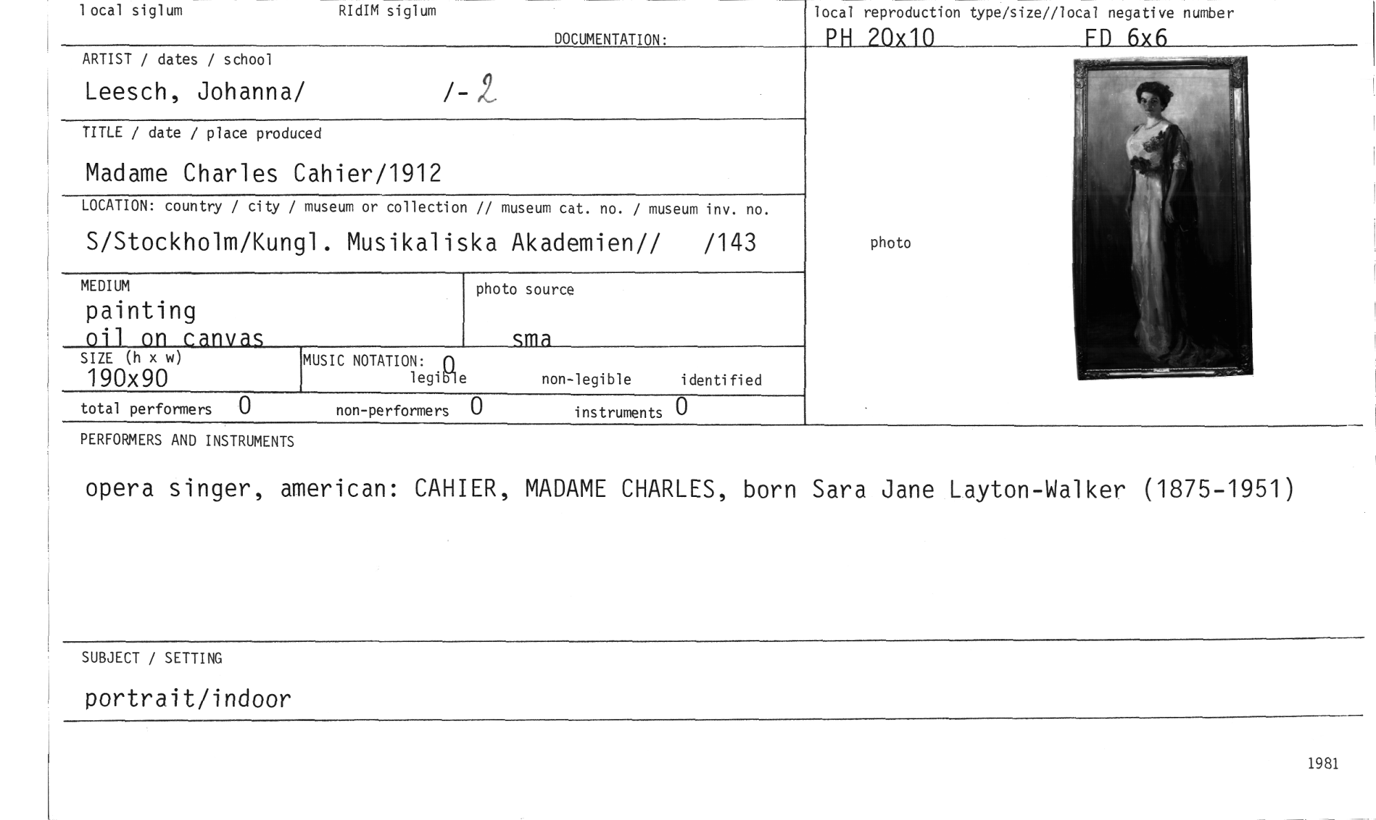 //// local siglum R dIM siglum //// DOCUMENTATION: //// local reproduction type/size//local negative number //// PH 20x10 FD 6x6 //// ARTIST / dates / school //// Leesch, Johanna/ 1-2; //// TITLE / date / place produced //// Madame Charles Cahier/1912 //// LOCATION: country / city / museum or collection // museum cat. no. / museum inv. no. //// S/Stockholm/Kungl. Musikaliska Akademien// /143 //// MEDIUM //// painting //// oil on canvas //// SIZE (h x w) //// 190x90 //// photo //// photo source //// SM a //// MUSIC NOTATION: () //// legiBle non-legible identified //// total performers 0 non-performers 0 instruments 0 //// PERFORMERS AND INSTRUMENTS //// opera singer, american: CAHIER, MADAME CHARLES, born Sara Jane Layton-Walker (1875-1951) //// SUBJECT / SETTING //// portrait/indoor //// 1981 ////