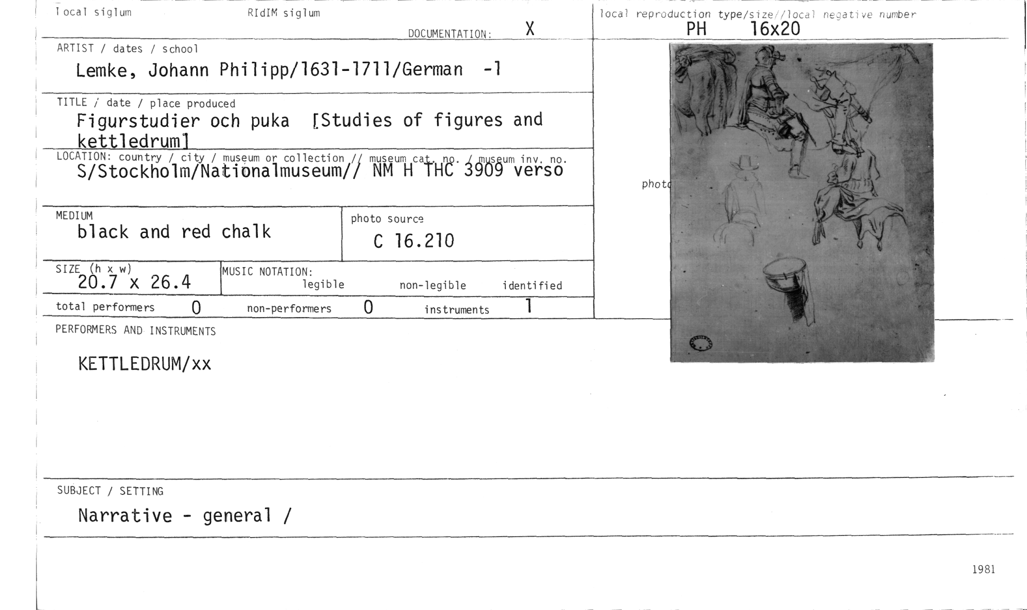//// photo source //// C 16.210 //// MEDIUM //// black and red chalk //// non-performers //// total performers //// 1 ocal siglum //// RIdIM siglum //// DOCUMENTATION: //// ARTIST / dates / school //// Lemke, Johann Philipp/1631-1711/German -1 //// TITLE / date / place produced //// Figurstudier och puka [Studies of figures and //// kettledruml //// LOCATION: country / city / museum or collection // museum cal,- no. /museum inv. no. //// S/Stockholm/Nationalmuseum// NM H THC 3909 verso //// phot //// SIZE (h x w) //// 20.7 x 26.4 //// MUSIC NOTATION: //// legible //// non-legible identified //// PERFORMERS AND INSTRUMENTS //// KETTLEDRUM/xx //// SUBJECT / SETTING //// Narrative - general / //// local reproduction type/size//local negative number //// PH 16x20 //// 1981 ////
