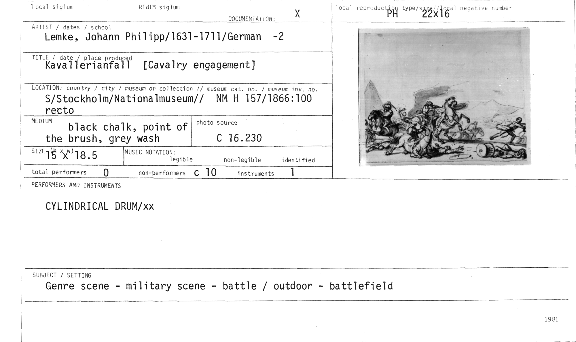 //// 19 81 //// MUSIC NOTATION: //// legible //// non-legible i den ti fi ed //// total performers 0 //// non-performers C 1 0 instruments 1 //// 1 ocal siglum RIdIM siglum //// DOCUMENTATION : //// x //// ARTIST / dates / school //// Lemke, Johann Philipp/1631-1711/German -2 //// TITLE / date/ place produced //// Kavallerianfall [Cavalry engagement] //// LOCATION: country / city / museum or collection 1/ museum cat. no. / museum inv. no. //// S/Stockholm/Nationalmuseum// NM H 157/1866:100 recto //// MEDIUM //// black chalk, point of the brush, grey wash //// srzEfg xxw)18.5 //// PERFORMERS AND INSTRUMENTS //// CYLINDRICAL DRUM/xx //// SUBJECT / SETTING //// Genre scene - military scene - battle / outdoor - battlefield //// local reproductg type/säital negative number //// photo source //// C 16.230 ////
