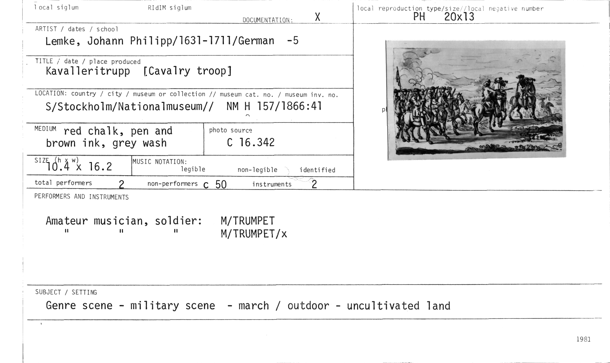 //// 1 ocal siglum //// RIdIM siglum //// DOCUMENTATION; //// local reproduction type/size//local negative number //// PH 20x13 //// ARTIST / dates / school //// Lemke, Johann Philipp/1631-1711/German -5 //// TITLE / date / place produced //// Kavalleritrupp [Cavalry troop] //// LOCATION: country / city / museum or collection // museum cat. no. / museum inv. no. //// S/Stockholm/Nationalmuseum// NM H 157/1866:41 //// MEDIUM red chalk, pen and //// brown ink, grey wash //// siz, (h. //// lo 4w)x 16.2 //// MUSIC NOTATION: //// legible non-legible " i denti fi ed //// photo source //// C 16.342 //// P //// total performers 2 non-performers c 50 instruments //// PERFORMERS AND INSTRUMENTS //// Amateur musician, soldier: M/TRUMPET //// M/TRUMPET/x //// SUBJECT / SETTING //// Genre scene - military scene - march / outdoor - uncultivated land //// 1981 ////