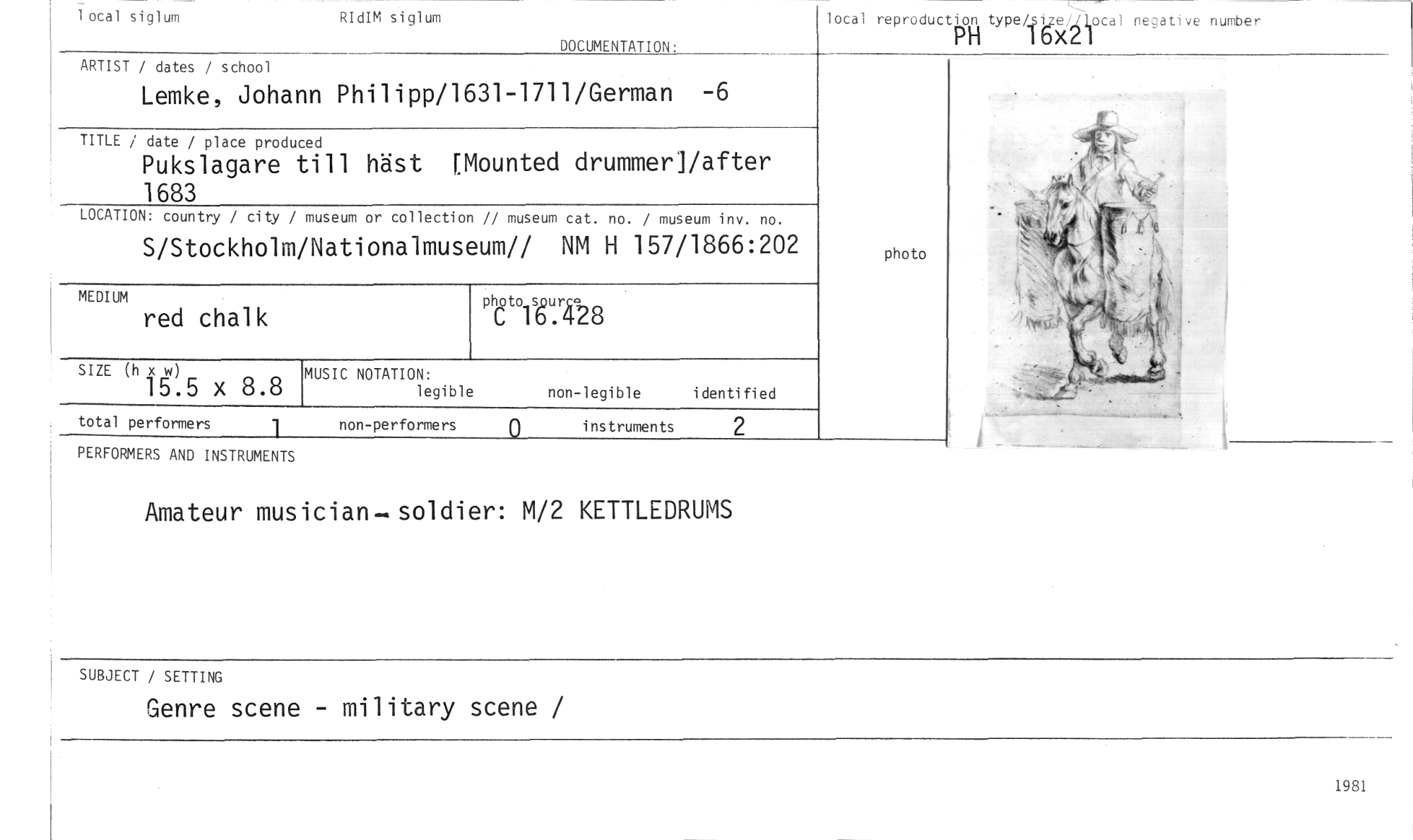 //// local siglum RIdIM siglum //// DOCUMENTATION: //// local reproduction tYPetsize,../Local negative nurober //// PH 16x21 //// ARTIST / dates / school //// Lemke, Johann Philipp/1631-1711/German -6 //// TITLE / date / place produ //// Pukslagare //// 1683 //// LOCATION: country / city / //// S/Stockholm //// MEDIUM //// red chalk //// SIZE (h x w) //// 15.5 x 8.8 //// total performers 1 //// museum or collection // museum cat. no. / museum inv. no. //// /Nationalmuseum// NM H 157/1866:202 //// photo //// photo //// C 1.4b //// MUSIC NOTATION: //// legible non-legible identified //// non-performers 0 instruments 2 //// ced //// till häst [Mounted drummer]/after //// PERFORMERS AND INSTRUMENTS //// Amateur musician—soldier: M/2 KETTLEDRUMS //// SUBJECT / SETTING //// Genre scene - military scene / //// 1981 ////