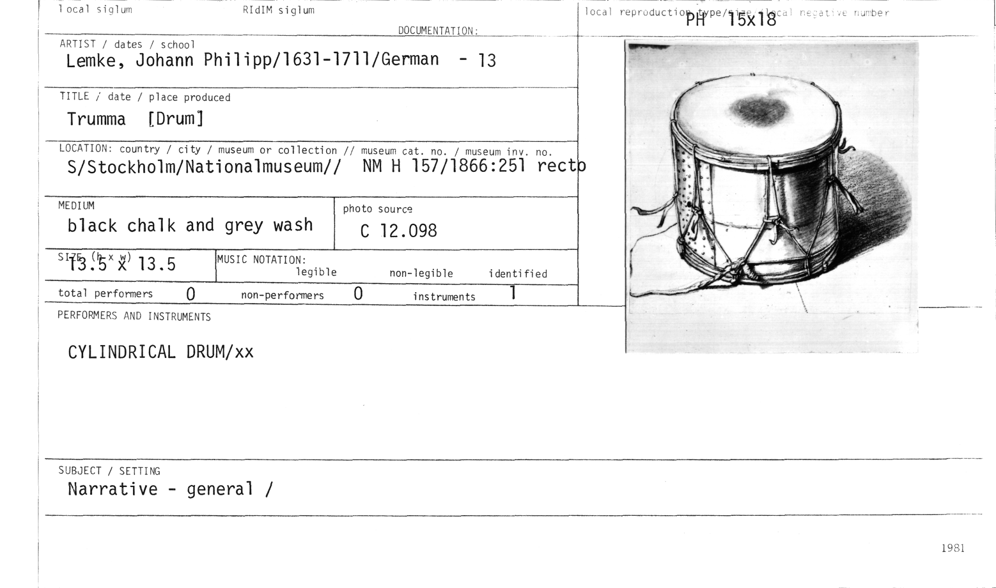 //// grey wash //// MEDIUM //// black chalk and //// (r )( Ä) 13.5 //// instruments //// total performers non-performers 0 //// local siglum //// RIdIM siglum //// local reproductio lype/Iisscitcal necatve nurober //// DOCUMENTATION: //// ARTIST / dates / school //// Lemke, Johann Philipp/1631-1711/German - 13 //// TITLE / date / place produced //// Trumma [Drum] //// LOCATION: country / city / //// S/Stockholm/Nat //// MUSIC NOTATION: //// legible //// photo source //// C 12.098 //// 1 //// museum or collection // museum cat. no. / museum inv. no. //// ionalmuseum// NM H 157/1866:251 rectD //// non-legible i denti fi ed //// PERFORMERS AND INSTRUMENTS //// CYLINDRICAL DRUM/xx //// SUBJECT / SETTING //// Narrative - general / ////