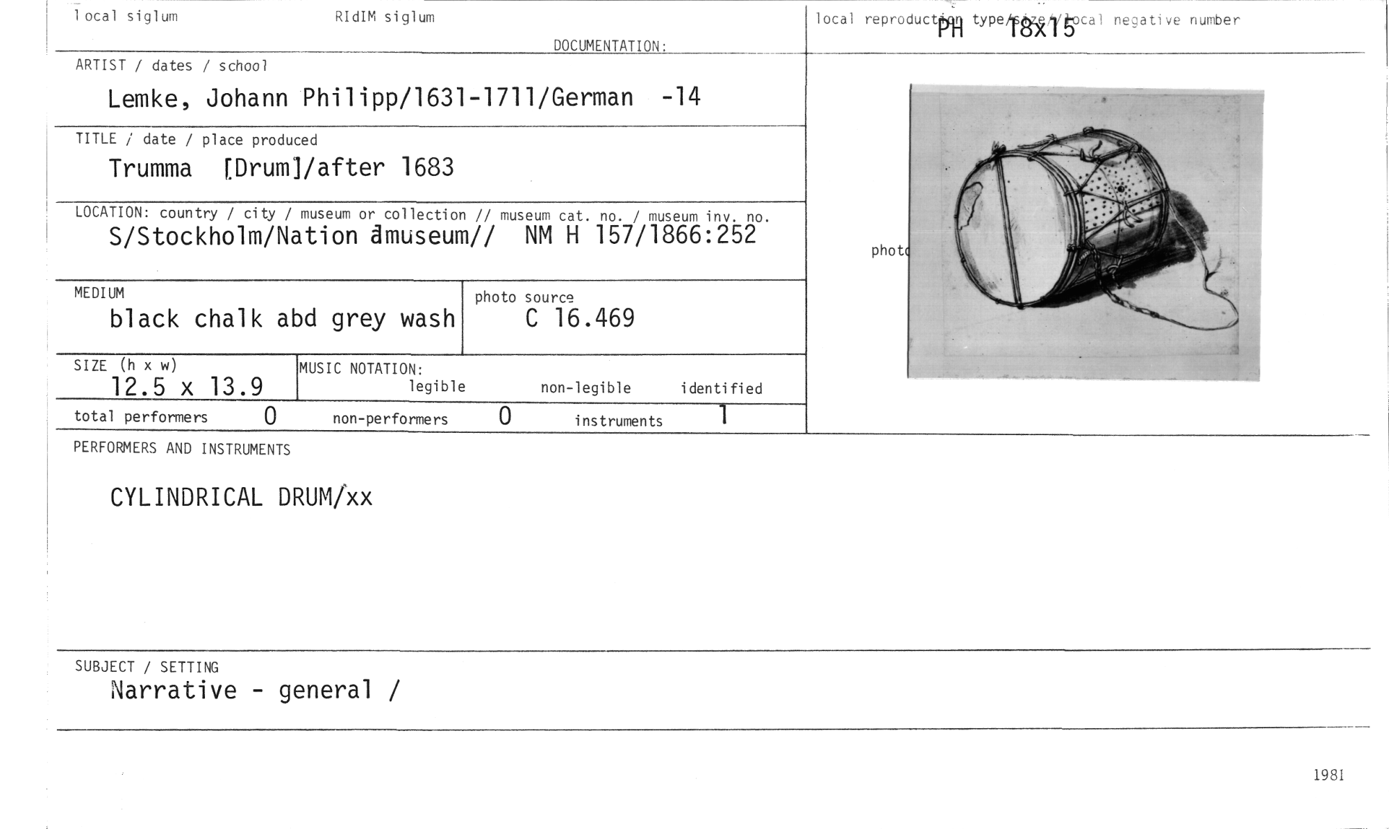 //// 1 ocal siglum RIdIM siglum DOCUMENTATION: //// ARTIST / dates / school //// Lemke, Johann Philipp/1631-1711/German -14 //// TITLE / date / place produced //// Trumma [Drum]/after 1683 //// LOCATION: country / city / museum or collection // museum cat. no. / museum inv. no. //// S/Stockholm/N tion ämuseum// NM H 157/1866:252 //// photo source //// C 16.469 local reproductppp typelffilSocal negative number //// MEDIUM //// black chalk a //// bd grey wash //// phot //// SIZE (h x w) //// 12.5 x 13.9 //// MUSIC NOTATION: //// legible //// non-legible identified //// total performers 0 non-performers 0 instruments 1 //// PERFORMERS AND INSTRUMENTS //// CYLINDRICAL DRUM/xx //// SUBJECT / SETTING //// Narrative - general / //// 1981 ////