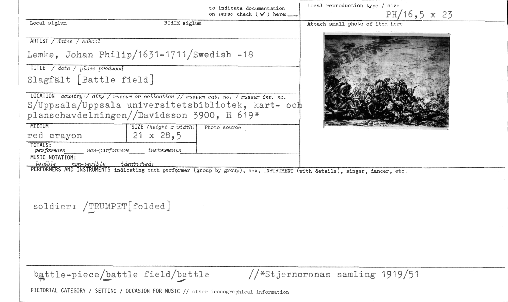 //// to indicate documentation Local reproduction type / size //// on verso check (V ) //// PH/16 5 x 23 //// Local siglum RIdIM siglum //// ARTIST / dates / school //// Lemke, Johan Philip/1631-1711/Swedish -18 //// TITLE / date / place produced //// Slagfält [Battle field] //// LOCATION country / city / museum or collection // museum cat. no. / museum tnv. no. //// S/Uppsala/Uppsala universitetsbibliotek, kart- oc planschavdelningen//Davidsson 3900, H 619* //// SIZE (height x width) //// 21 x 28,5 //// UTM377--- //// per formers non-perfbrmers instruments //// MEDIUM //// red crayon //// Photo source //// Attach small photo of item here //// MUSIC NOTATION: //// is aible non-leaible identified: //// PERFORMERS AND INSTRUMENTS indicating each performer (group by group), sex, INSTRUMENT //// soldier: /TRUMPET[folded] //// (with details), singer, dancer, etc. //// b.Nttle-piece/battle field/battle //*Stjerncronas samling 1919/51 //// PICTORIAL CATEGORY / SETTING / OCCASION FOR MUSIC // other iconographical information ////