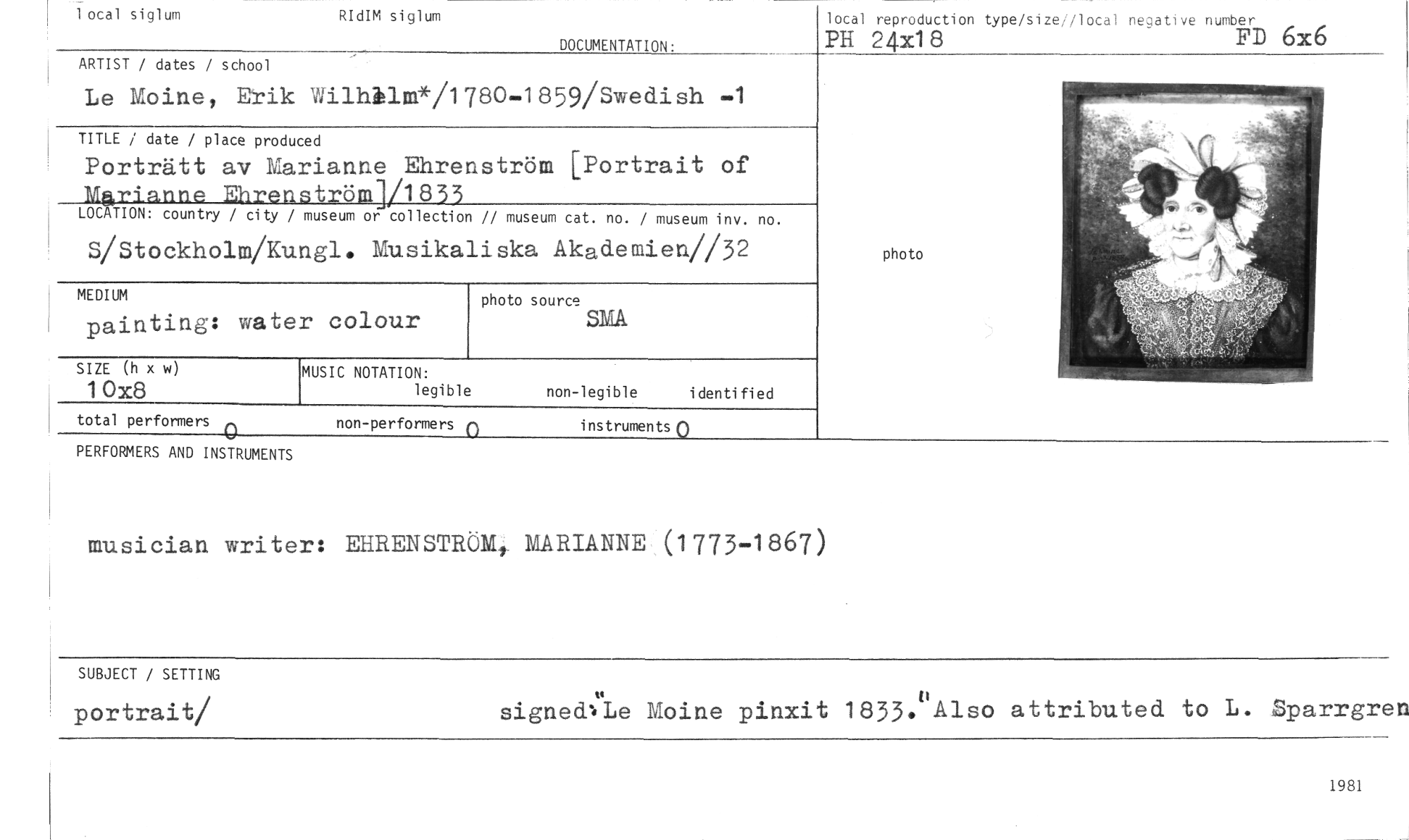 //// 1 ocal siglum RIdIM siglum //// DOCUMENTATION: //// local reproduction type/size //// PH 24x18 //// local negative nutuber //// FD 6x6 //// photo //// ARTIST / dates / school //// Le Moine, Erik Wilhilm*/1780-1859/Swedish -1 //// TITLE / date / place produced //// Porträtt av Marianne Ehrenström [Portrait of Märianne Ehrenström]/1813 //// LOCATION: country / city / museum or collection // museum cat. no. / museum inv. no. //// S/Stockholm/Kungl. Musikaliska Akademien//32 //// photo source //// SMÅ //// SIZE (h x w) 10x8 //// MEDIUM //// painting: water colour //// MUSIC NOTATION: //// legible non-legible identified //// 0 //// total performers //// non-performers ninstruments //// PERFORMERS AND INSTRUMENTS //// musician writer: EHRENSTROM, MARIANNE (1773-1867) //// SUBJECT / SETTING signed%Le Moine pinxit 1833.DAlso attributed to L. Sparrgren //// portrait/ //// 1981 ////