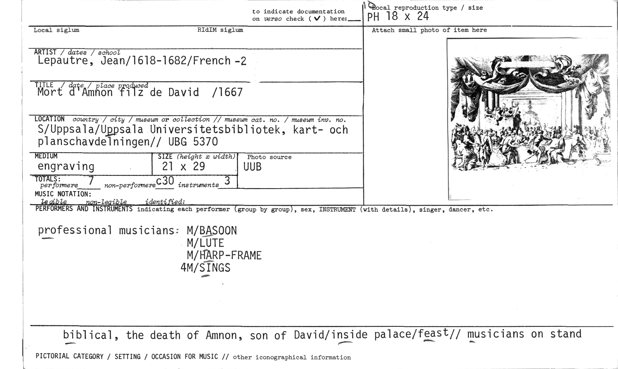 //// to indicate documentation //// on versa check (%1 ) here:_ //// Local siglum RIdIM siglum //// ARTIST / dates / school //// Lepautre, Jean/1618-1682/French -2 //// TITLE /date / place vrioduced //// Mort d'Amnon flz de David /1667 //// LOCATION country / city / museum or collection // museum cat. no. / museum inv. no. //// S/Uppsala/Upsala Universitetsbibliotek, kart- och planschavdelningen// UBG 5370 //// MEDIUM //// engraving //// group), sex, INSTRUMENT (with details), singer, dancer, etc. //// professional musicians: M/BASOON //// M/LUTE //// M/HÄRP-FRAME 4M/SINGS //// biblical, the death of Amnon, son of David/inside palace/feast// musicians on stand //// PICTORIAL CATEGORY / SETTING / OCCASION FOR MUSIC // other iconographical information //// TOM: //// per formers 7 non-perfbrmers c30 instruments 3 //// MUSIC NOTATION: //// 4vcible non-leaible identilUd: //// PERFORMERS AND INSTRUMENTS indicating each performer (group by //// SIZE (height x width) //// 21 x 29 //// Photo source //// UUB //// 14ocal reproduction type / size //// PH 18 x 24 //// Attach small photo of item here ////
