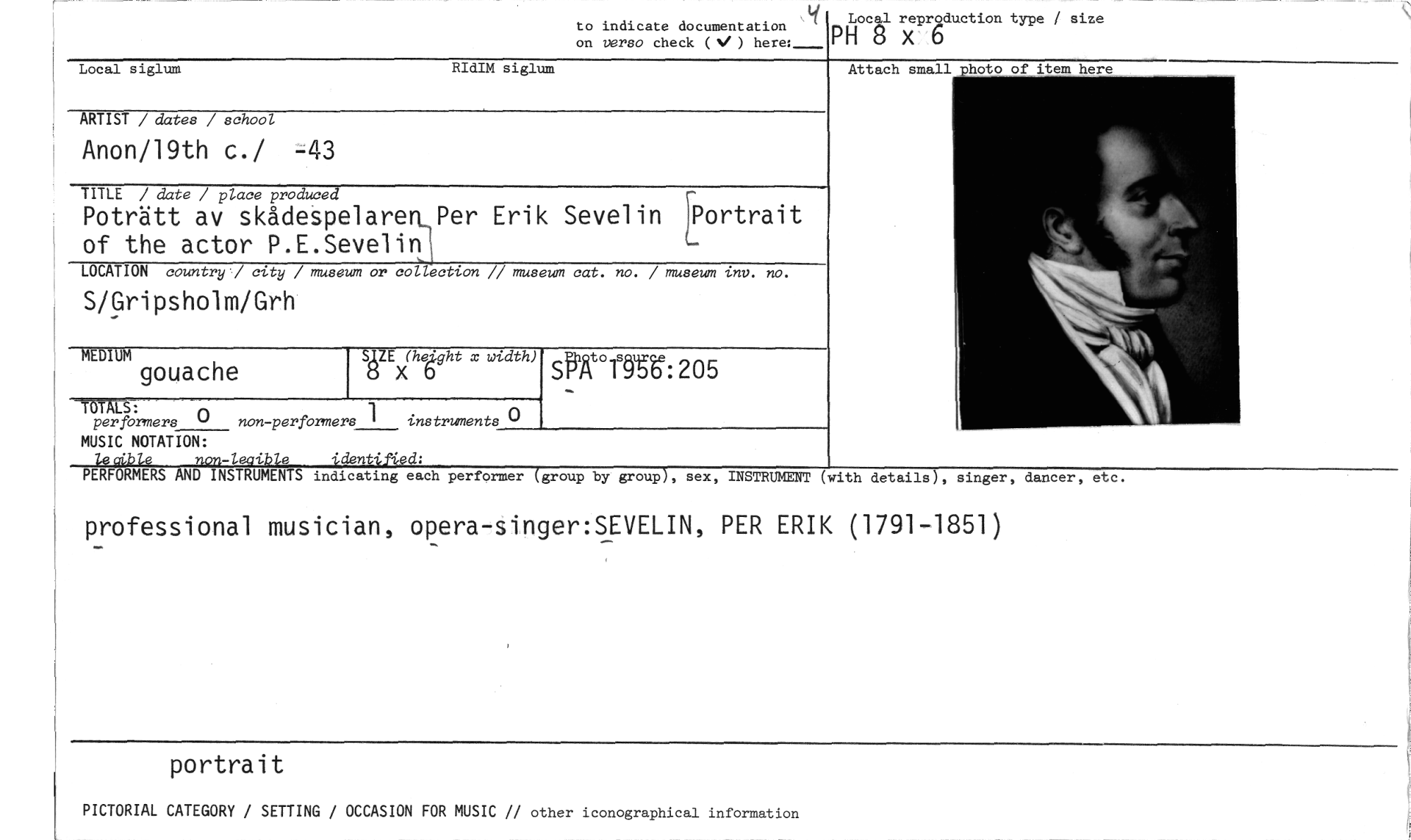 //// to indicate documentation //// on versa check ( ) here:___ //// Local reproduction type / size //// PH 8 x 6 //// Local siglum RIdIM siglum //// Attach small //// ARTIST / dates / school //// Anon/19th c./ -43 //// TITLE / date / place produced //// Poträtt av skådespelare Per Erik Sevelin JPortrait of the actor P.E.Sevelin //// LOCATION country / city / museum or collection // museum cat. no. / museum inv. no. //// S/Gripsholm/Grh //// MEDIUM //// gouache //// St3k°15g5g:205 //// SeT,Z E X (hgight r width) ö 0 //// TOTALS: //// per formers o non—performem 1 instruments //// MUSIC NOTATION: //// le aible non-lepible //// PERFORMERS AND INSTRUMENTS indicating each performer (group by group), sex, //// INSTRUMENT (with details), singer, dancer, etc. //// professional musician, opera-singer:SEVELIN, PER ERIK (1791-1851) //// portrait //// PICTORIAL CATEGORY / SETTING / OCCASION FOR MUSIC // other iconographical information ////