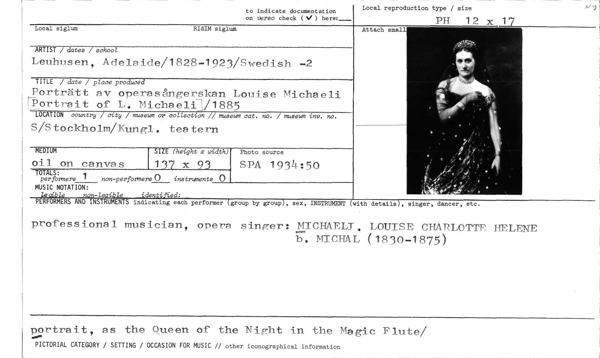 //// SIZE (height x width) //// 137 x 93 //// 73TALS: //// per formers 1 non-performers 0 instruments 0 //// to indicate documentation //// on verso check (N/ ) here:_ //// Local siglum RIdIM siglum //// ARTIST / dates / school //// Leuhusen, Adelaide/1828-1923/Swedish -2 //// TITLE / date / place produced //// Porträtt av operasångerskan Louise Michaeli rPortrait of L. Michaeli/1885 //// LOCATION country / city / museum or collection // museum cat. no. / museum inv. no. //// S/Stockholm/Kungl. teatern //// MUSIC NOTATION: //// non-leaible identified: //// PERFORMERS AND INSTRUMENTS indicating each performer (group by group), sex, //// Local reproduction type / size //// P-FE 12 x 1 //// INSTRUMENT (with details), singer, dancer, etc. //// professional musician, onera singer: MICHAELT, LOUISE CHARLOTTE HELENE //// b. MICHAL (1830-1875) //// portrait, as the Queen of the Night in the Magic Flute/ //// - //// PICTORIAL CATEGORY / SETTING / OCCASION FOR MUSIC // other iconographical information //// Photo source //// SPA 1934:50 //// MEDIUM //// ou 1. on canvas ////