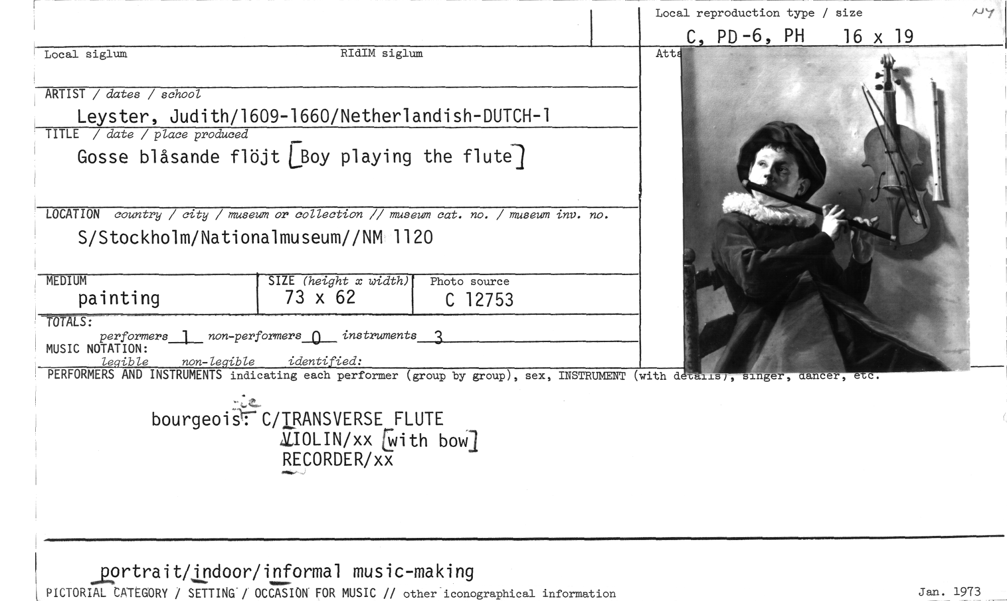 //// Local reproduction type / size //// C, PD-6, PH 16 x 19 //// //// Att //// Local siglum RIdIM siglum //// ARTIST / dates / school //// Leyster, Judith/1609-1660/Netherlandish-DUTCH-1 //// TITLE / date / place produced //// Gosse blåsande flöjt Boy playing the flute] //// LOCATION country / city / museum or collection // museum cat. no. / museum inv. no. //// S/Stockholm/Nationalmuseum//NM 1120 //// MEDIUM //// painting //// SIZE (height x width) //// 73 x 62 Photo source //// C 12753 //// MALS: //// performers_j_ non-performers_a__ instruments 3 MUSIC NOTATION: //// legible non-legible identified: //// PERFORMERS AND INSTRUMENTS indicating each performer (group by group), sex, INSTRUMENT (with d aiis) singer, //// bourgeofv: C/TRANSVERSE FLUTE //// AUOLIN/xx 5With bowl RECORDER/xx //// _eortrait/indoor/informal music-making //// PICTORIAL CATEGORY / SETTING / OCCASIOM FOR MUSIC // other iconographical information //// Jan. 1973 ////