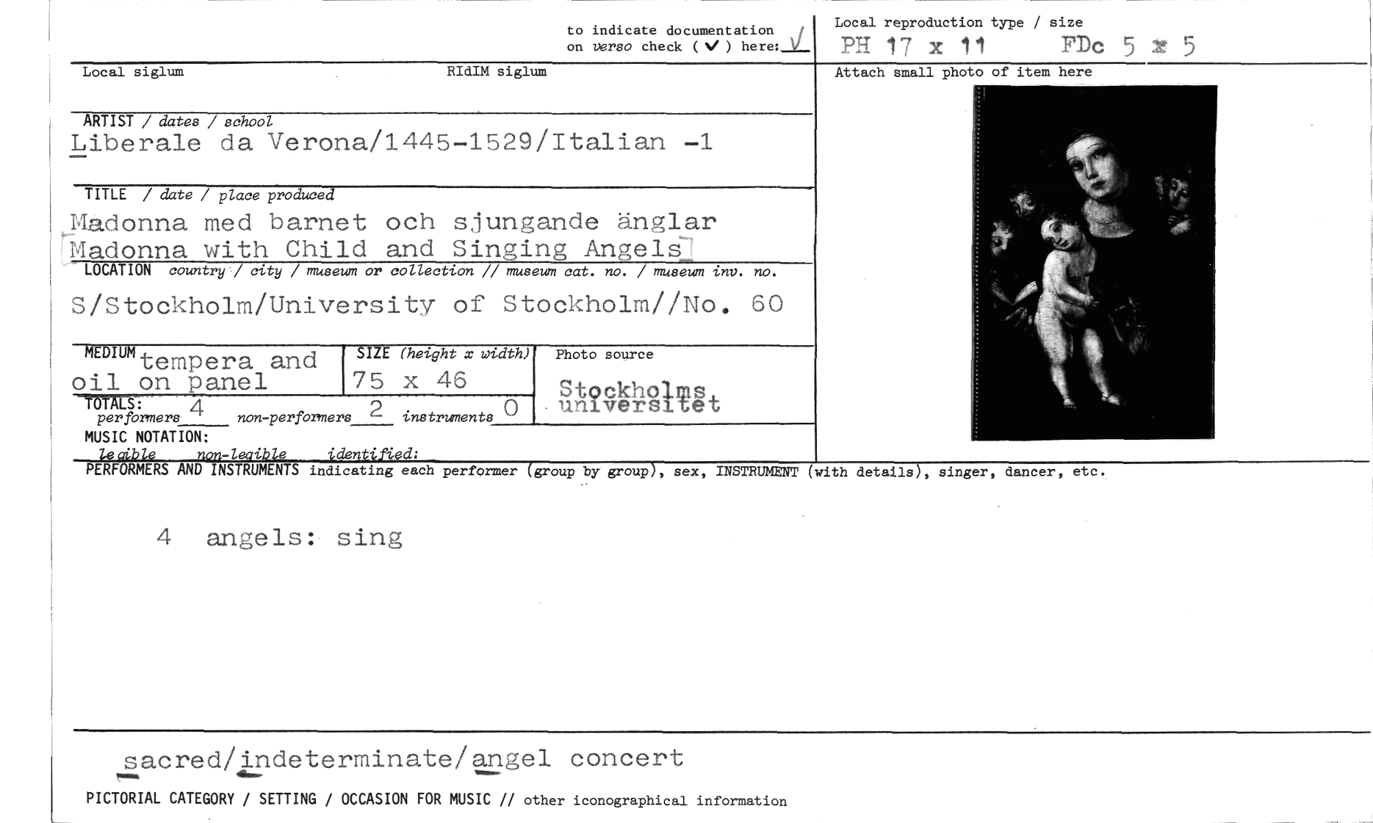 //// to indicate documentation on verso check ( ) here: //// Local reproduction type / size //// PH 17 x 11 Ffc 5 2e 5 //// Local siglum RIdIM siglum //// ARTIST / dates / school //// Liberale da Verona/1445-1529/Italian -1 //// TITLE / date / place produced //// ,padonna med barnet och sjungande änglar Madonna with Child and Singing Angelå-7 //// - LOCATION country / city / museum or collection // museum cat. no. / museum inv. no. //// S/Stockholm/University of Stockholm//No. 60 //// SIZE (height x width) //// 75 x 46 //// TOTALS: //// per formers ' non-perfbrmers instruments //// MUSIC NOTATION: //// tesible non-legible identified: //// nmmtempera and //// oil on panel //// Photo source //// Stockholms //// unih //// versitet //// Attach small photo of item here //// PERFORMERS AND INSTRUMENTS indicating each performer (group by group), sex, INSTRUMENT (with details), singer, dancer, etc. //// 4 angels: sing //// sacred/indeterminate/angel concert //// Mo. 4I,s.- //// PICTORIAL CATEGORY / SETTING / OCCASION FOR MUSIC // other iconographical information ////