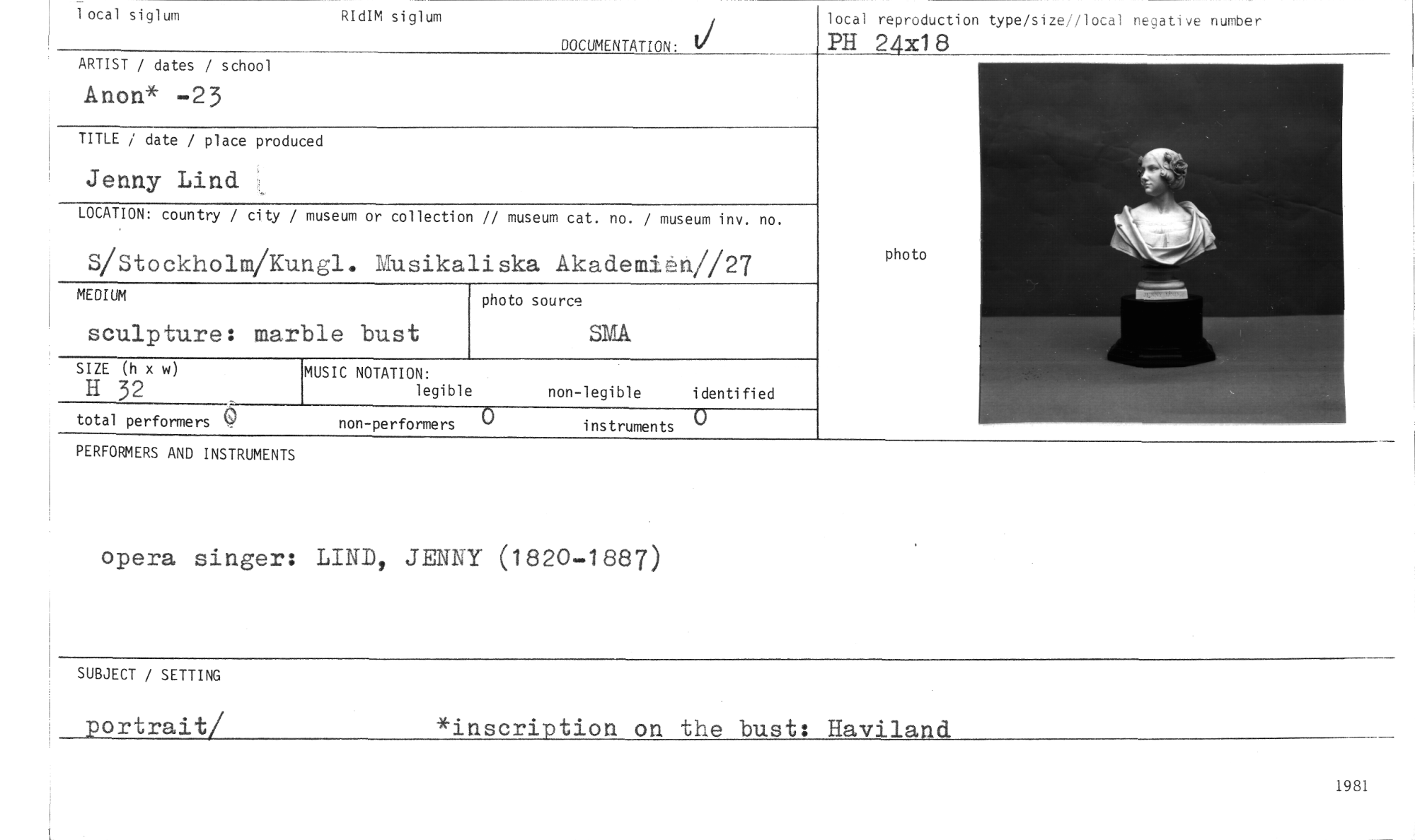 //// local siglum RIdIM siglum //// DOCUMENTATION: ti //// local reproduction type/size//local negative number //// PH 24x18 //// ARTIST / dates / school //// Anon* -23 //// TITLE / date / place produced //// Jenny Lind L //// LOCATION: country / city / museum or collection // museum cat. no. / museum inv. no. //// S/Stockholm/Kungl. Musikaliska Akademien//27 //// MEDIUM //// sculpture: marble bust //// MUSIC NOTATION: //// legible non-legible identified //// total performers non-performers 0 instruments //// SIZE (h x w) //// H 32 //// photo source //// SMÅ //// photo //// PERFORMERS AND INSTRUMENTS //// opera singer: LIND, JENNY (1820-1887) //// SUBJECT / SETTING //// portrait/ *inscription on the bust: Haviland //// 1981 ////