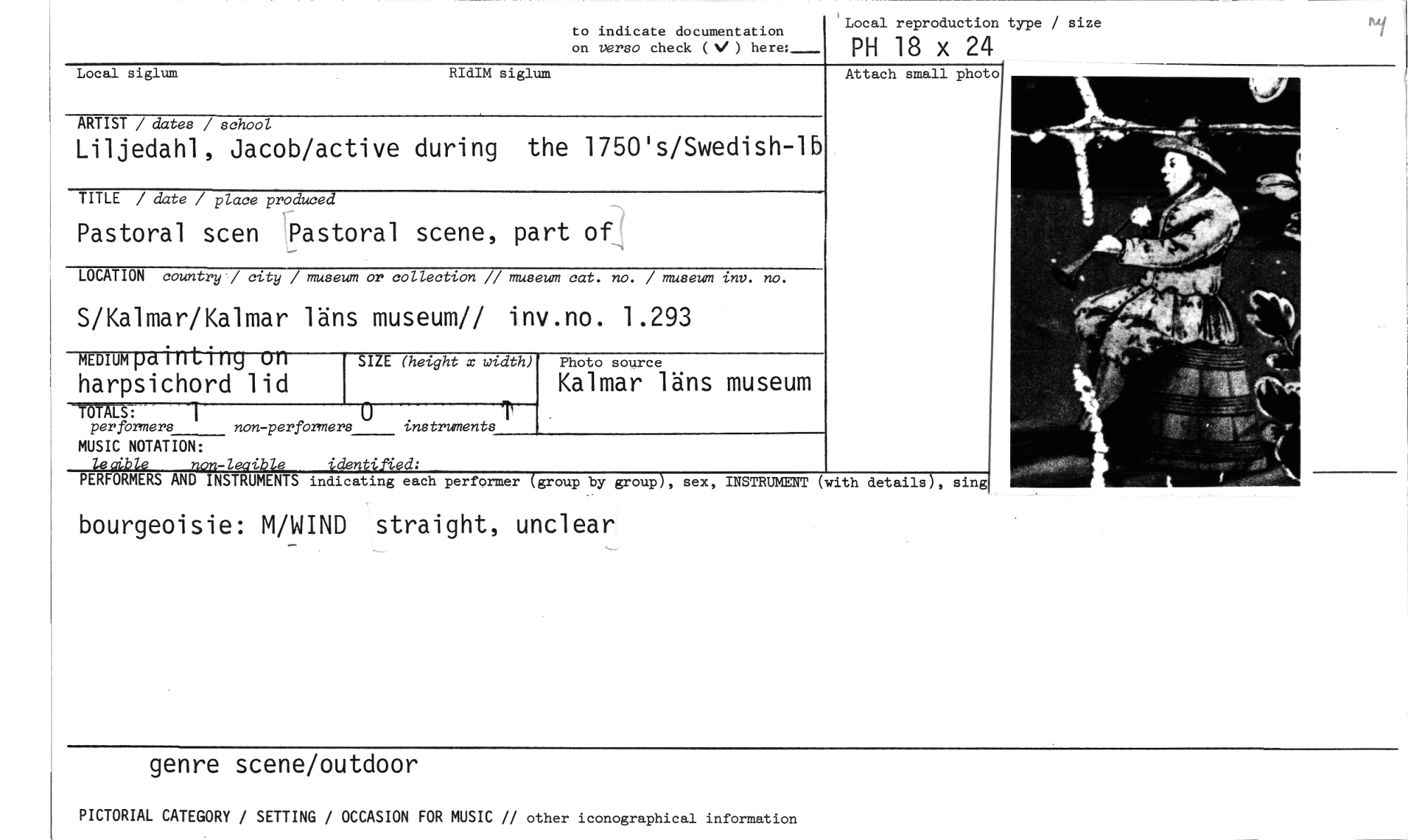 //// Local reproduction type / size //// to indicate documentation on verso check (V ) here: //// Local siglum RIdIM siglum //// ARTIST / dates / school //// Liljedahl, Jacob/active during the 1750's/Swedish-lb //// TITLE / date / place produced //// Pastoral scen Pastoral scene, part of //// LOCATION country / city / museum or collection // museum cat. no. / museum inv. no. //// S/Kalmar/Kalmar läns museum// inv.no. 1.293 //// SIZE (height x width) //// harpsichord lid //// per formers non-performers instruments //// MUSIC NOTATION: //// lecible non-leaible identified: //// PERFORMERS AND INSTRUMENTS //// bourgeoisie: M/WIND straight, unclear //// mummoinLing UH //// Photo source //// Kalmar läns museum //// PH 18 x 24 //// Attach small photo //// indicating each performer (group by group), sex, INSTRUMENT (with details), sing //// genre scene/outdoor //// PICTORIAL CATEGORY / SETTING / OCCASION FOR MUSIC // other iconographical information ////