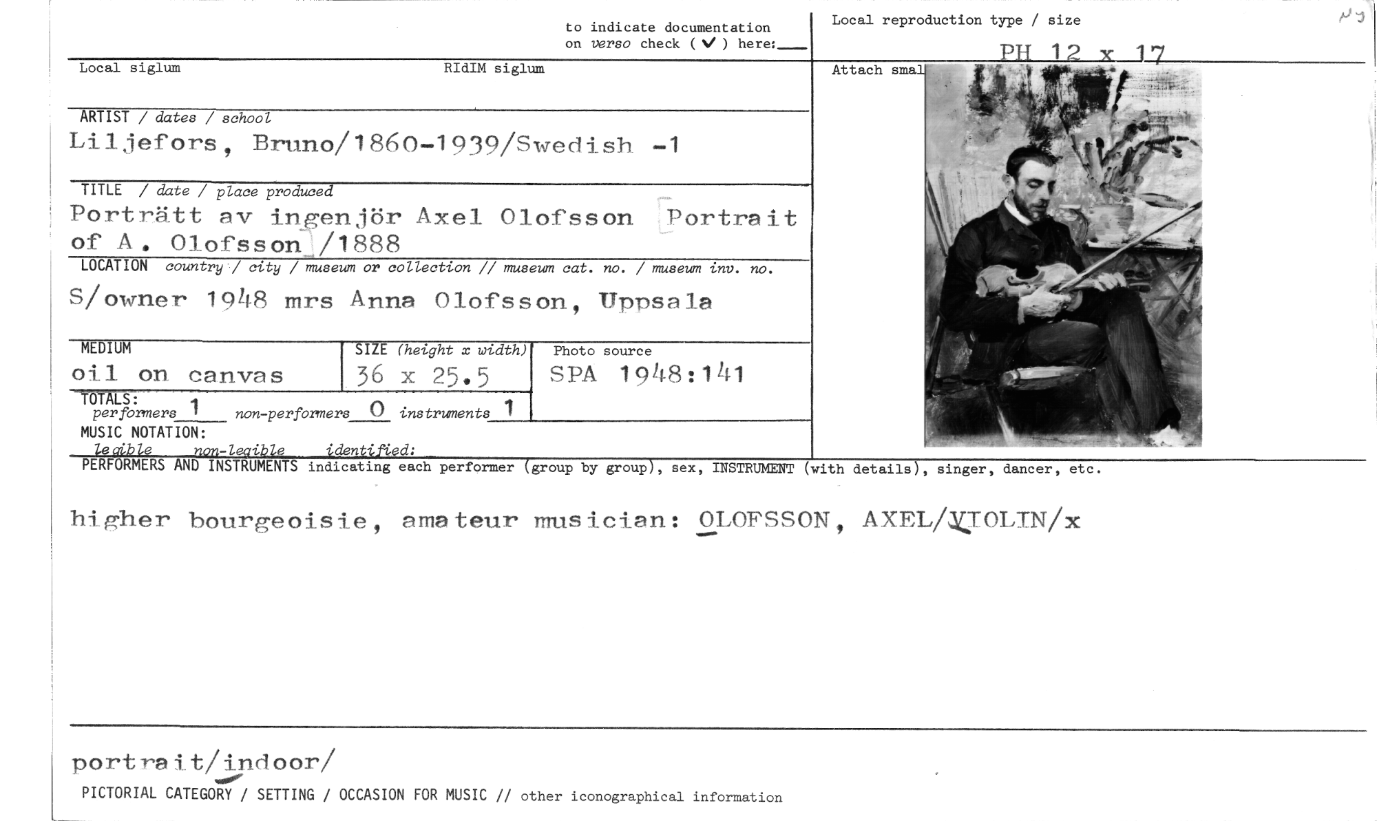 //// to indicate documentation on verso check (V ) here: //// Local reproduction type / size //// PH 12 Y 17 //// Attach s //// Local siglum RIdIM siglum //// ARTIST / dates / school //// Liljefors, Bruno/1860-1939/Swedish -1 //// TITLE / date / place produced //// Porträtt av ingenjör Axel Olofsson Portrait //// of A. Olofsson./1888 //// LOCATION country / city / museum or collection // museum cat. no. / museum inv. no. //// S/owner 1948 mrs Anna Olofsson, Uppsala //// MEDIUM SIZE (height x width) 36 x 25.5 Photo source //// oil on canvas SPA 1948:141 //// //// TOTALS: //// per formers 1 non-perfbrners () instruments 1 //// MUSIC NOTATION: //// leaible non-leaible identified: //// PERFORMERS AND INSTRUMENTS indicating each performer (group by group), sex, INSTRUMENT //// (with details), singer, dancer, etc. //// higher bourgeoisie, amateur musician: OLOFSSON, AXEL/VOLTN/x //// portrait/indoor/ //// PICTORIAL CATEGORY / SETTING / OCCASION FOR MUSIC // other iconographical information ////