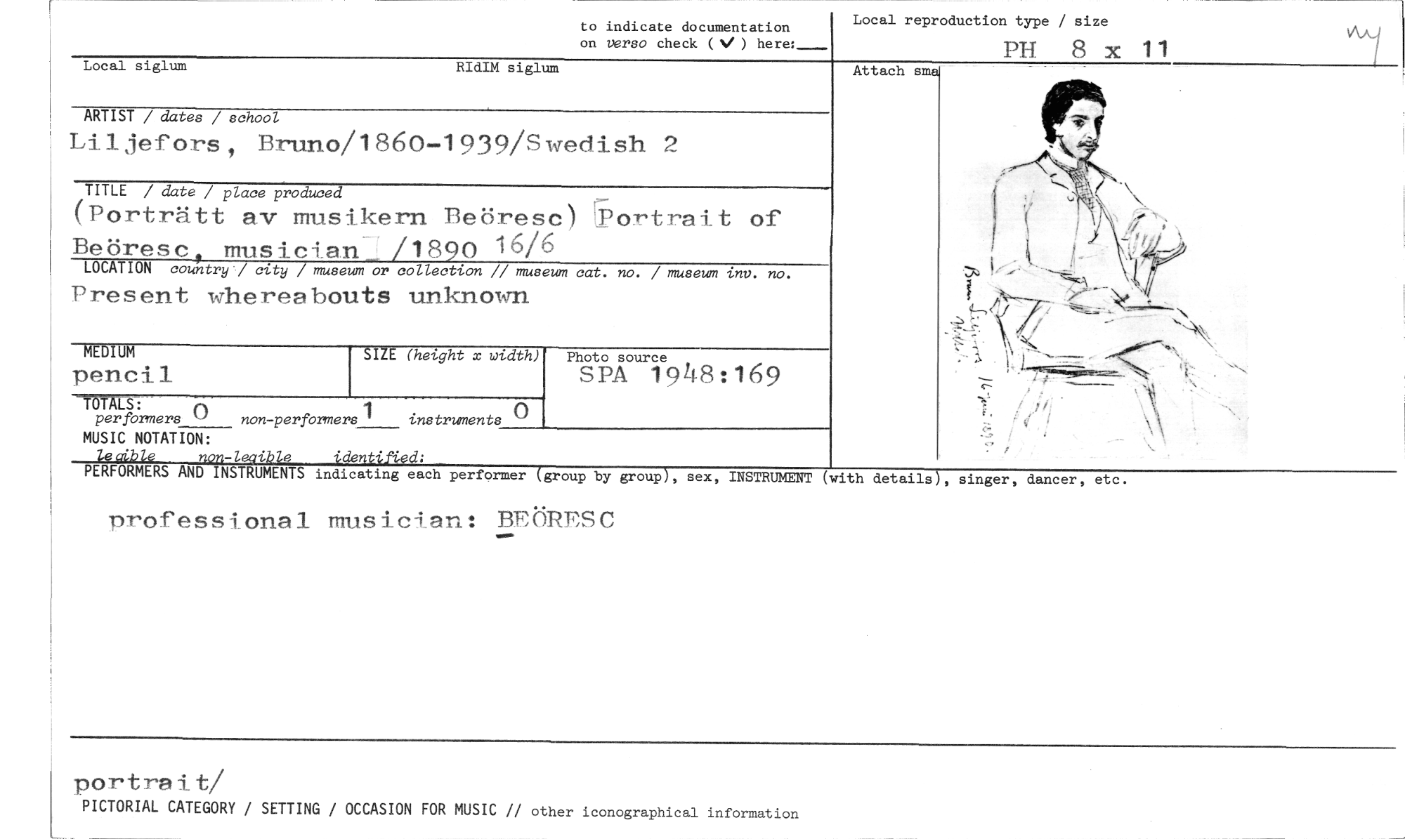 //// to indicate documentation on versa check (N/ ) here: //// Local reproduction type / size //// PH 8 x 11 //// Local siglum RIdIM siglum //// Attach s //// ARTIST / dater / school //// Liljefors, Bruno/1860-1939/Swedish 2 //// TITLE / date / place produced //// (Porträtt av musikern Beöresc) [Portrait of Beörescs musician. /1890 16/6 //// LOCATION country / city / museum or collection // museum cat. no. / museum int,. no. //// Present whereabouts unknown //// Photo source //// SPA 1948:169 //// -TÖTALS: //// per formers 0 non-performers1 instruments //// MUSIC NOTATION: //// legible rum-lecible identified; //// PERFORMERS AND INSTRUMENTS indicating each performer (group by group), //// professional musician: BEÖRESC //// MEDIUM //// pencil //// SIZE (height x width) //// sex, INSTRUMENT (with details , singer, dancer, etc. //// portrait/ //// PICTORIAL CATEGORY / SETTING / OCCASION FOR MUSIC // other iconographical information ////