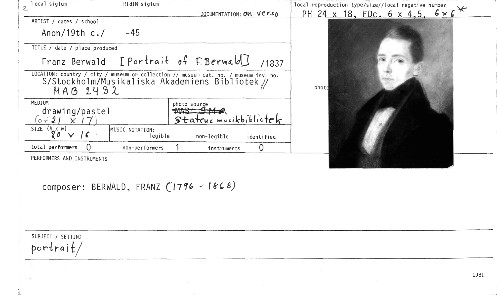 //// 1 ocal siglum //// RIdIM siglum //// DOCUMENTATION : oVl verS0 //// local reproduction type/size//local negative number //// PH P4 x 18. FDc. 6 x 4.5 w //// ARTIST / dates / school //// Anon/19th c./ -45 //// TITLE / date / place produced //// Franz Berwald r pörkr.a o' V, 13ervittle /1837 //// LOCATION: country / city / museum or collection // museum cat. no. / museum inv. no. //// S/Stockholm/Musikaliska Akademiens Bibliotek// //// 1 A g /II 32, //// phot //// MEDIUM //// drawing/pastel //// for J/ y I 7, //// SIZE (h x w) //// 2 Ne //// photo source //// —4511 //// MUSIC NOTATION: //// legible //// non-legible identified //// total performers 0 non-performers //// PERFORMERS AND INSTRUMENTS //// composer: BERWALD, FRANZ 0796 - rkG0 //// SUBJECT / SETTING //// pOrira i f/ //// 1981 ////