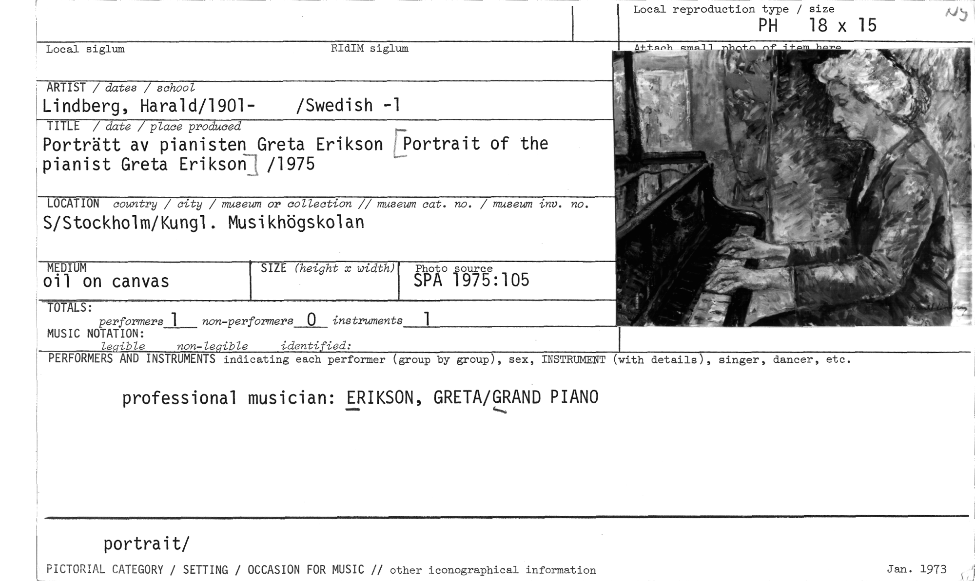 //// Local reproduction type / size //// PH 18 x 15 //// Local siglum RIdIM siglum //// ARTIST / dates / school //// Lindberg, Harald/1901- /Swedish -1 //// TITLE / date / place produced //// Porträtt av pianisten Greta Erikson Portrait of the pianist Greta Erikson /1975 //// LOCATION country / city / museum or collection // museum cat. no. museum -Inv. no. //// S/Stockholm/Kungl. Musikhögskolan //// MEDIUM //// oil on canvas //// SIZE (height x width) //// Photo SPA råg: 1 05 //// TOTALS: //// performers 1 non-performers 0 instruments 1 //// MUSIC NOTATION: //// le ible non-le ible identi ied: //// PERFORMERS AND INSTRUMENTS indicating each performer (group by group), sex, INSTRUMENT (with details), singer, dancer, etc. //// professional musician: ERIKSON, GRETA/GRAND PIANO //// portrait/ //// PICTORIAL CATEGORY / SETTING / OCCASION FOR MUSIC // other iconographical information //// Jan. 1973 ////