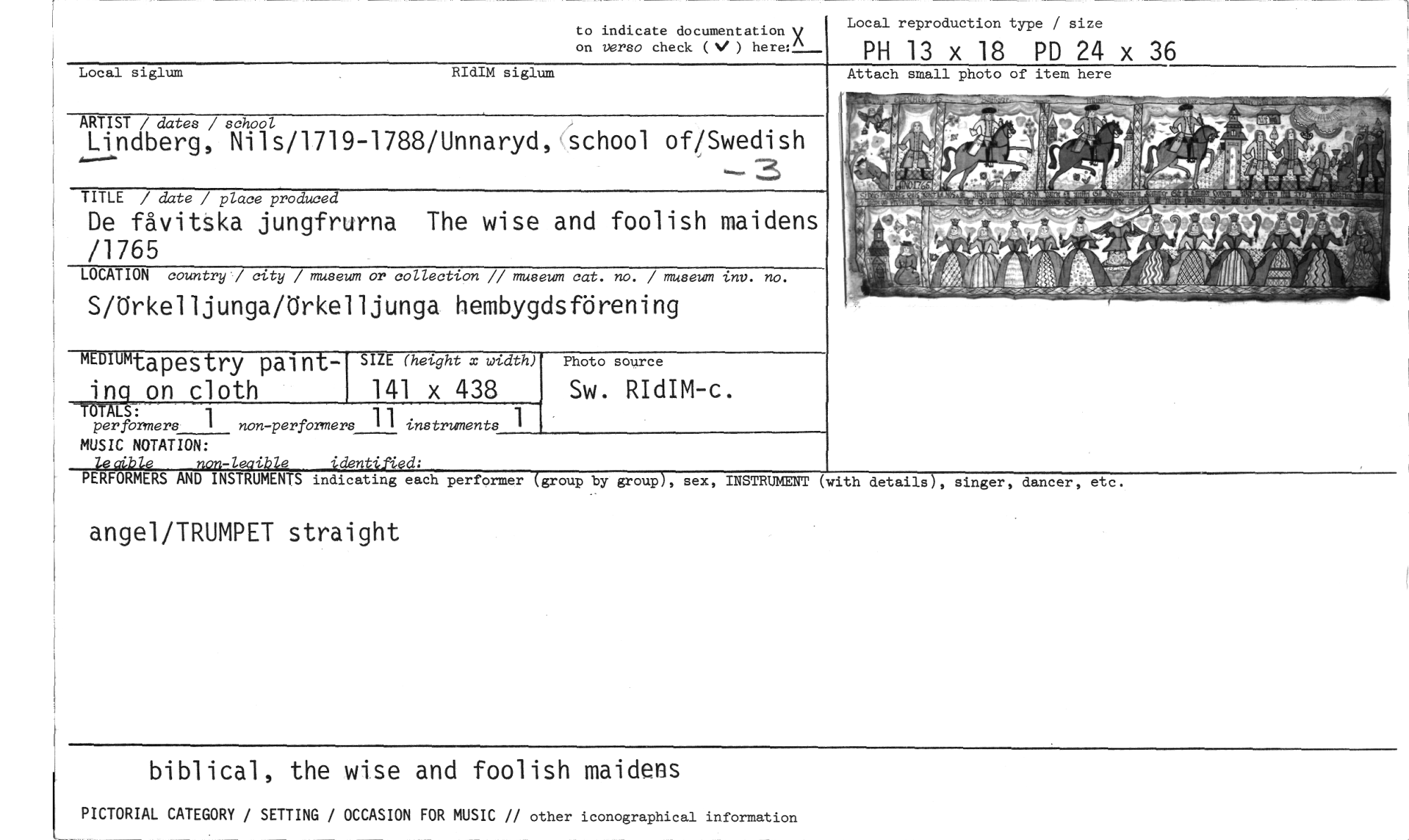 //// to indicate documentation y on verso check (NI ) here:n_ //// Local reproduction type / size //// PH 13 x 18 PD 24 x 36 //// Attach small photo of item here //// Local siglum RIdIM siglum //// ARTIST / dates / school //// Lindberg, Nils/1719-1788/Unnaryd, school of/Swedish //// TITLE / date / place produced //// De fåvitska jungfrurna The wise and foolish maidens /1765 //// LOCATION country / city / museum or collection // museum cat. no. / museum inv. no. //// S/Örkelljunga/örkelljunga hembygdsförening //// MEMUM4- //// Lapestry painting on cloth //// TOTALS: //// per formers 1 non-performers 1 1 instruments 1 //// MUSIC NOTATION: //// le4ible non-leaible identified; //// PERFORMERS AND INSTRUMENTS indicating each performer (group by group), sex, INSTRUMENT (with details), singer, dancer, etc. //// angel/TRUMPET straight //// biblical, the wise and foolish maidens //// PICTORIAL CATEGORY / SETTING / OCCASION FOR MUSIC // other iconographical information //// SIZE (height x width) //// 141 x 438 //// Photo source //// Sw. RIdIM-c. ////