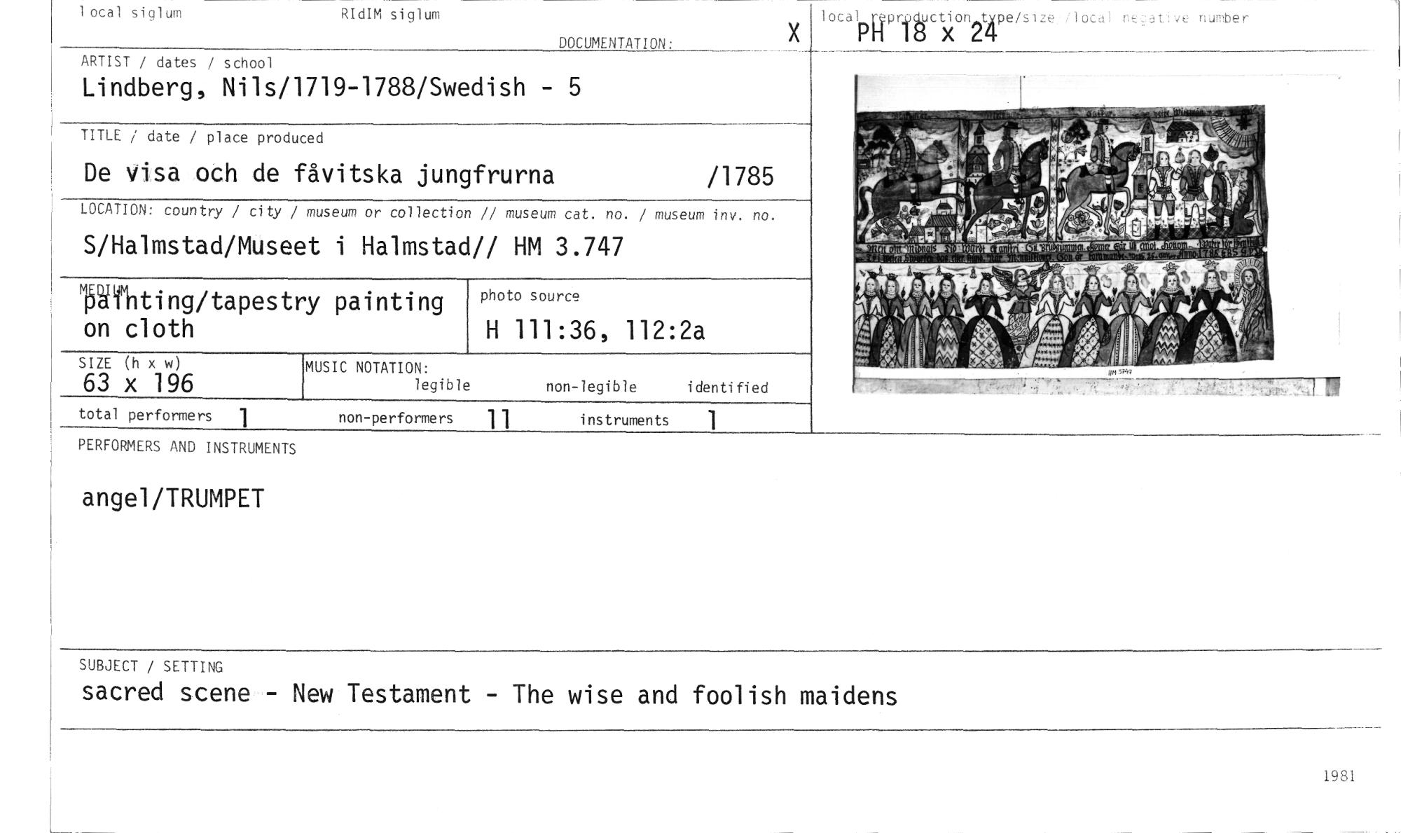 //// X //// localPH reproduction_2type/size local nead ve nurober //// 18 4 //// ARTIST / dates / school //// Lindberg, Nils/1719-1788/Swedish - 5 //// TITLE / date / place produced //// De visa och de fåvitska jungfrurna /1785 //// LOCATION: country / city / museum or collection // museum cat. no. / museum inv. no. //// S/Halmstad/Musee t i Halmstad!! HM 3.747 //// Nfhting/tapestry painting on cloth //// MUSIC NOTATION: //// legible non-legible identified //// total performers 1 non-performers 11 instruments 1 //// photo source //// H 111:36, 112:2a //// SIZE (h x w) //// 63 x 196 //// , . //// 1.4..._6 I //// '.-r.:iå'''''swilikiratrirlim:FrrIrrrymminesvp7signon1 -- //// — - t, p i //// local siglum RIdIM siglum //// DOCUMENTATION: //// PERFORMERS AND INSTRUMENTS //// angel/TRUMPET //// SUBJECT / SETTING //// sacred scene - New Testament - The wise and foolish maidens ////