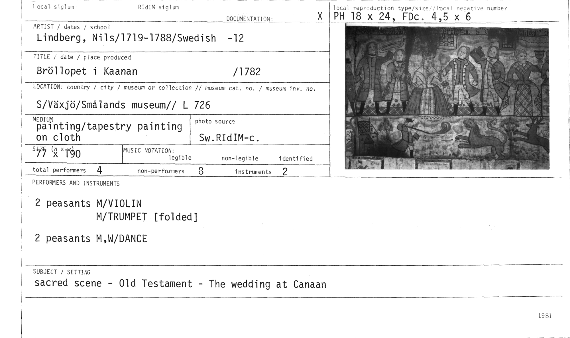 //// SUBJECT / SETTING //// sacred scene - Old Testament - The wedding at Canaan //// 1981 //// RIdIM siglum //// DOCUMENTATION• //// local reproduction type/size/iltcal negative number //// PH 18 x 24, FDc. 4,5 x 6 //// TITLE / date / place produced //// Bröllopet i Kaanan //// /1782 //// ARTIST / dates / school //// Lindberg, Nils/1719-1788/Swedish -12 //// LOCATION: country / city / museum or collection // museum cat. no. / museum inv. no. //// S/Växjö/Smålands museum// L 726 //// MEDIUM //// painting/tapestry painting on cloth //// photo source //// Sw.RIdIM-c. //// sY5 (>(xtåo //// total performers 4 //// MUSIC NOTATION: //// legible non-legible identified //// non-performers 8 instruments 2 //// PERFORMERS AND INSTRUMENTS //// 2 peasants M/VIOLIN //// M/TRUMPET [folded] //// 2 peasants M,W/DANCE //// 1 ocat siglum ////