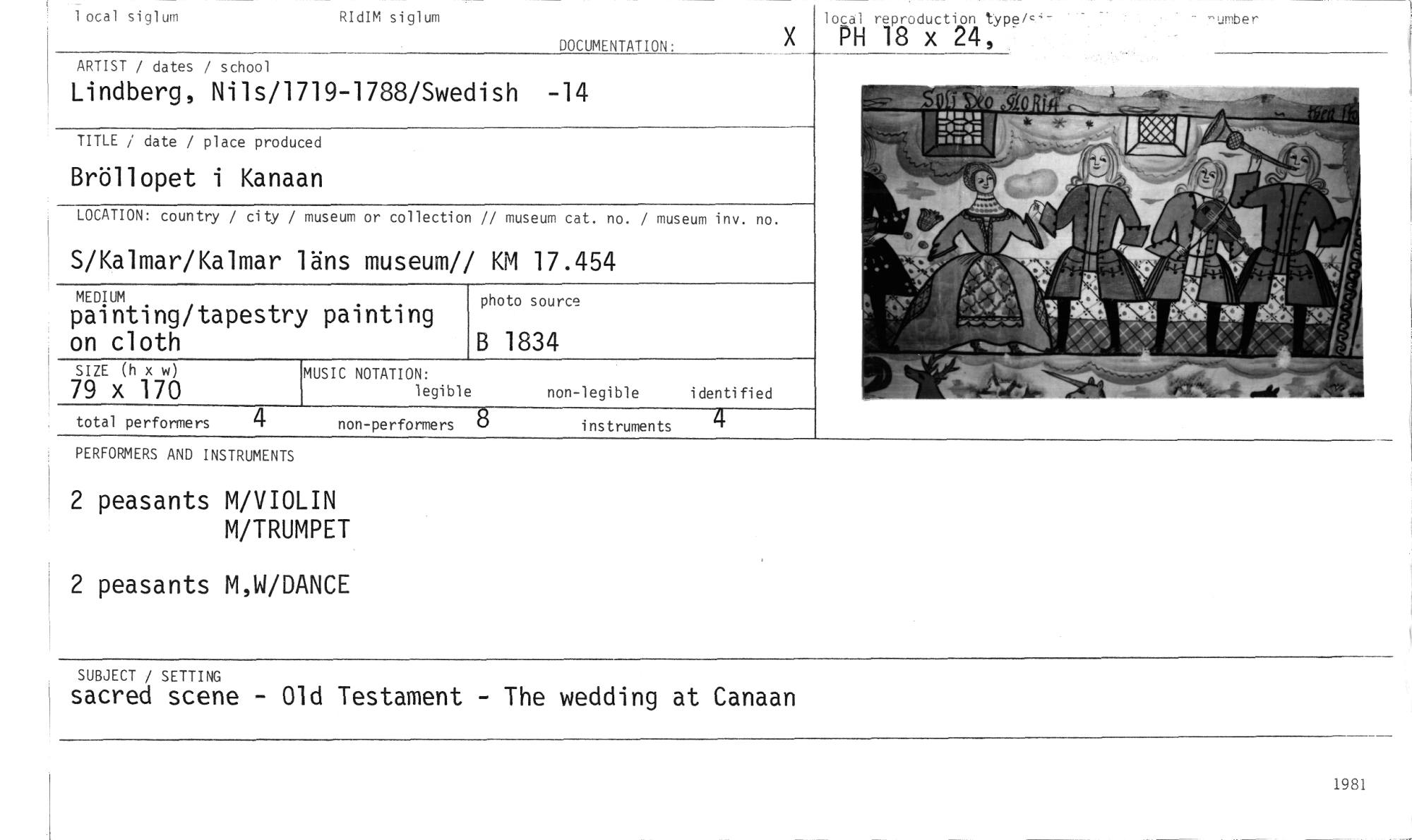 //// x //// local siglum RIdIM siglum //// DOCUMENTATION: //// local reproduction type/,'- //// PH 18 x 24, //// ARTIST / dates / school //// Lindberg, Nils/1719-1788/Swedish -14 //// TITLE / date / place produced //// Bröllopet i Kanaan //// LOCATION: country / city / museum or collection // museum cat. no. / museum inv. no. //// S/Kalmar/Kalmar läns museum// KM 17.454 //// MEDIUM //// painting/tapestry painting on cloth //// photo source //// B 1834 //// SIZE (h x w) //// 79 x 170 //// MUSIC NOTATION: //// legible non-legible identified //// total performers 4 non-performers 8 instruments 4 //// PERFORMERS AND INSTRUMENTS //// 2 peasants M/VIOLIN //// M/TRUMPET //// 2 peasants M,W/DANCE //// SUBJECT / SETTING //// sacred scene - Old Testament - The wedding at Canaan ////
