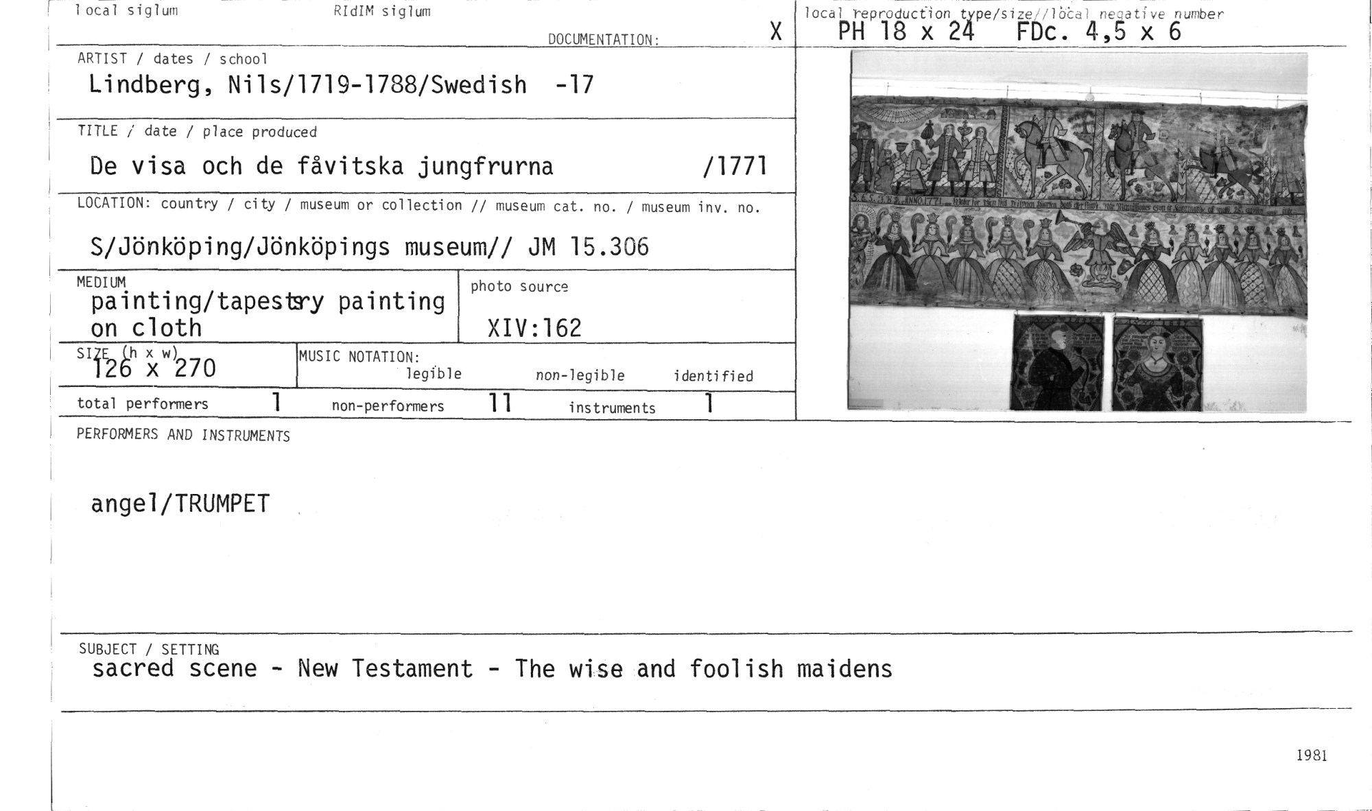 //// lotal reproduction peisize//lbCal negative nurober //// PH 18 x 2t FDc. 4,5 x 6 //// 1 ocal siglum RIdIM siglum DOCUMENTATION: //// ARTIST / lates / school //// Lindberg, Nils/1719-1788/Swedish -17 //// TITLE i date / place produced //// De visa och de fåvitska jungfrurna /1771 //// LOCATION: country / city / museum or collection // museum cat. no. / museum inv. no. //// S/Jönköping/Jönköpings museum// JM 15.306 //// MEDIUM //// painting/tapestry painting on cloth //// SIZE_ Ch x ) //// 126 xw270 //// photo source //// Å //// total performers 1 non-performers 1 1 instruments 1 //// PERFORMERS AND INSTRUMENTS //// angel/TRUMPET //// SUBJECT / SETTING //// sacred scene - New Testament - The wise and foolish maidens //// 1981 ////