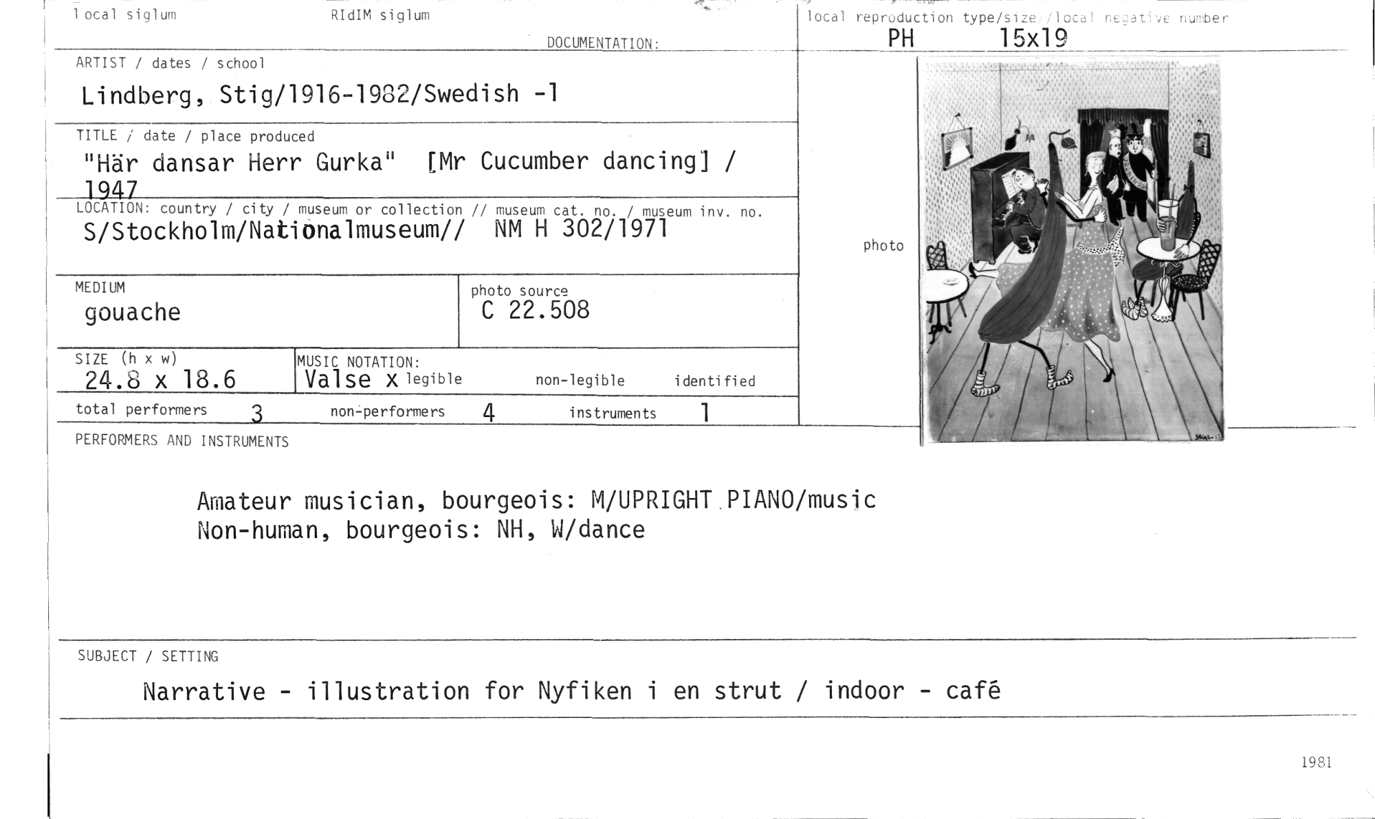 //// 1 ocal siglum RIdIM siglum //// DOCUMENTATION: //// local reproduction type/size local ne_ative nurober //// PH 15x19 //// ARTIST / dates / school //// Lindberg, Stig/1916-1982/Swedish -1 //// TITLE / date / place produced //// "Här dansar Herr Gurka" [Mr Cucumber dancing] / //// 1942 //// LOCATION: country / city / museum or collection // museum cat. no. / museum inv. no. //// S/Stockholm/Natiönalmuseum// NM H 302/1971 //// photo source //// C 22.508 //// MUSIC NOTATION: //// Valse X legible non-legible identified //// total performers 3 non-performers Q instruments //// PERFORMERS AND INSTRUMENTS //// MEDIUM //// gouache //// SIZE (h x w) //// 24.8 x 18.6 //// photo //// Amateur musician, bourgeois: M/UPRIGHT PIANO/music Non-human, bourgeois: NH, W/dance //// SUBJECT / SETTING //// Narrative - illustration for Nyfiken i en strut / indoor - café //// 19/ ////