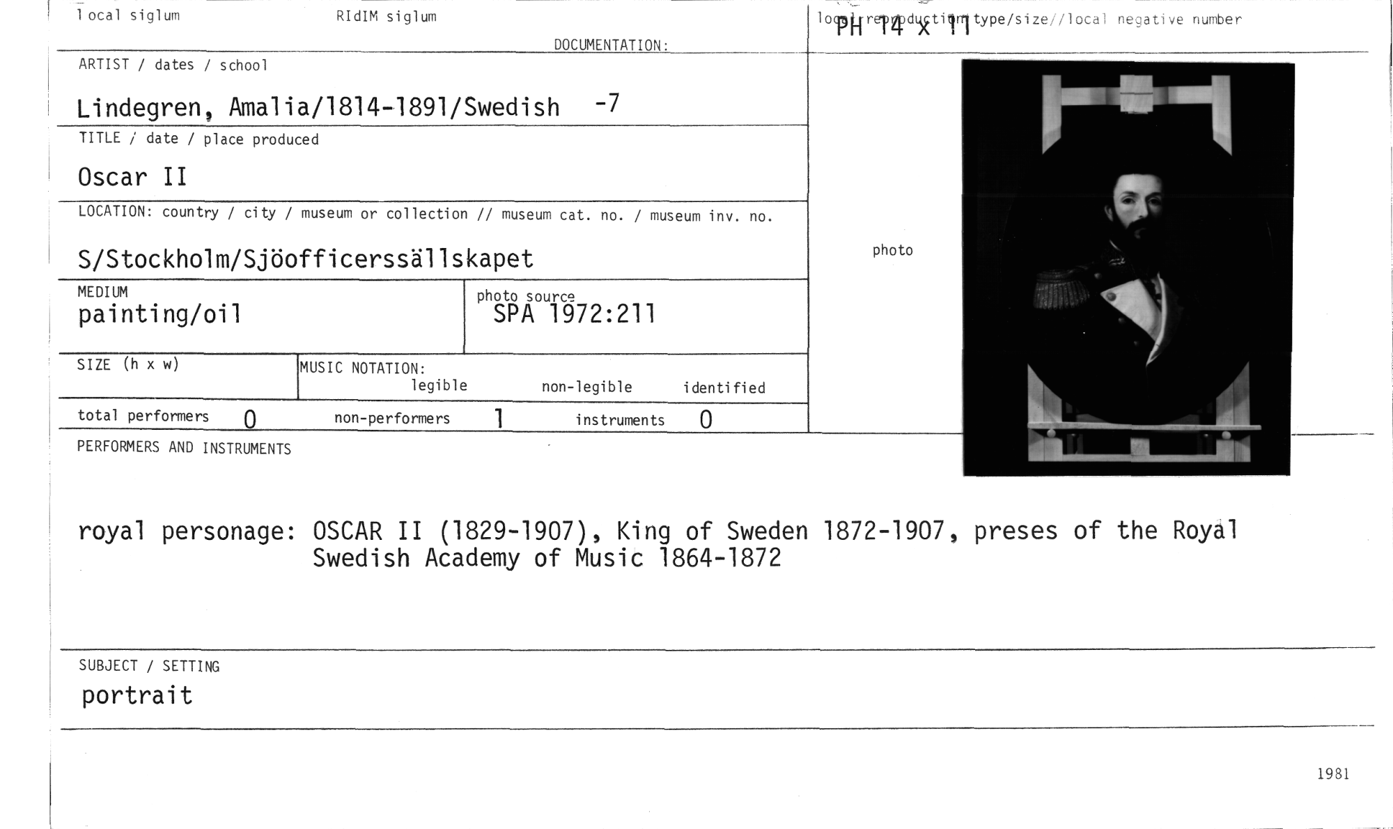 //// 1 ocal siglum RIdIM siglum //// DOCUMENTATION: //// 10/314rentd4k litype/size loea ne_at9ve number //// ARTIST / dates / school //// Lindegren, Amalia/1814-1891/Swedish //// TITLE / date / place produced //// Oscar II //// -7 //// 91. //// LOCATION: country / city / //// museum or collection // museum cat. no. / museum inv. no. //// photo //// photo source //// SPA 1972:211 //// S/Stockholm/Sjöo //// MEDIUM //// painting/oil //// SIZE (h x w) //// fficerssällskapet //// MUSIC NOTATION: //// legible //// non-legible identified //// total performers 0 non-performers 1 instruments 0 //// PERFORMERS AND INSTRUMENTS //// royal personage: OSCAR II (1829-1907), King of Sweden 1872-1907, preses of the Royal Swedish Academy of Music 1864-1872 //// SUBJECT / SETTING //// portrait //// 1981 ////