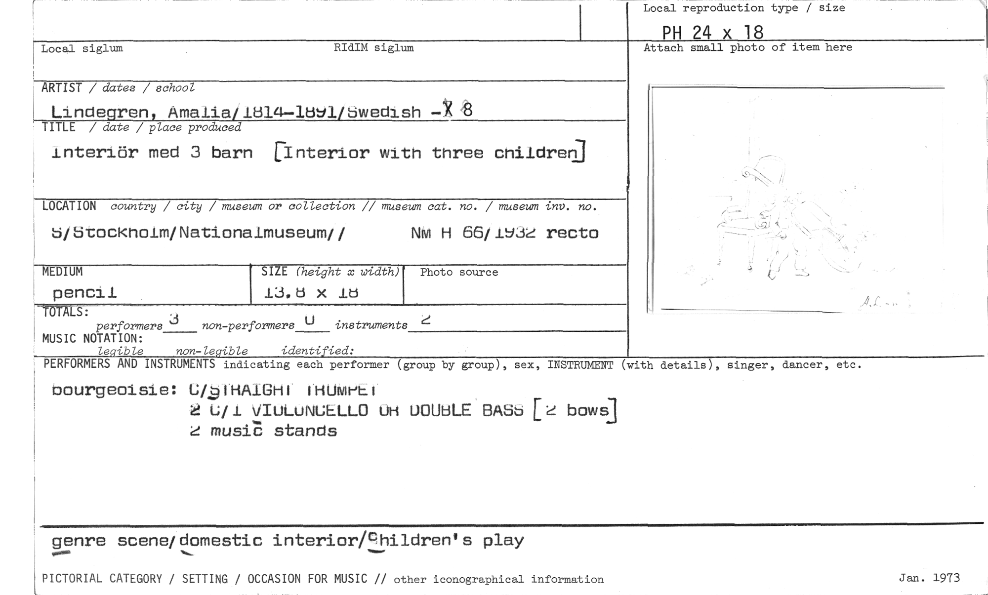 //// Local reproduction type / size //// PH 24 x 18 //// Attach small photo of item here //// Local siglum RIdIM siglum //// ARTIST / dates / school //// Lindegren, Amalia/1814-1891/bwedish //// TITLE / date / place produced //// Interiör med 3 barn rinterior with tnree cnildred //// LOCATION country / city / museum or collection // museum cat. no. / museum tns. no. //// b/SroCKMolm/Nationalmuseum// Nm H 66/193 recto //// MEDIUM SIZE (height x width) Photo source //// pencil 13.0 x ib //// //// -717,413:— //// performers non-performers ii instruments //// MUSIC NOTATION: //// legible non-legible identified: //// PERFORMERS AND INSTRUMENTS indicating each performer (group by group), sex, INSTRUMENT (with details), singer, dancer, etc. //// bourgeoisie: 1.4.91HAIGHI iHUmrti //// e U/1 VIULuNUELLO UH DOUBLE BASb [2 bows] music stands //// genre scene/domestic interior/children's play //// PICTORIAL CATEGORY / SETTING / OCCASION FOR MUSIC // other iconographical information Jan. 1973 ////