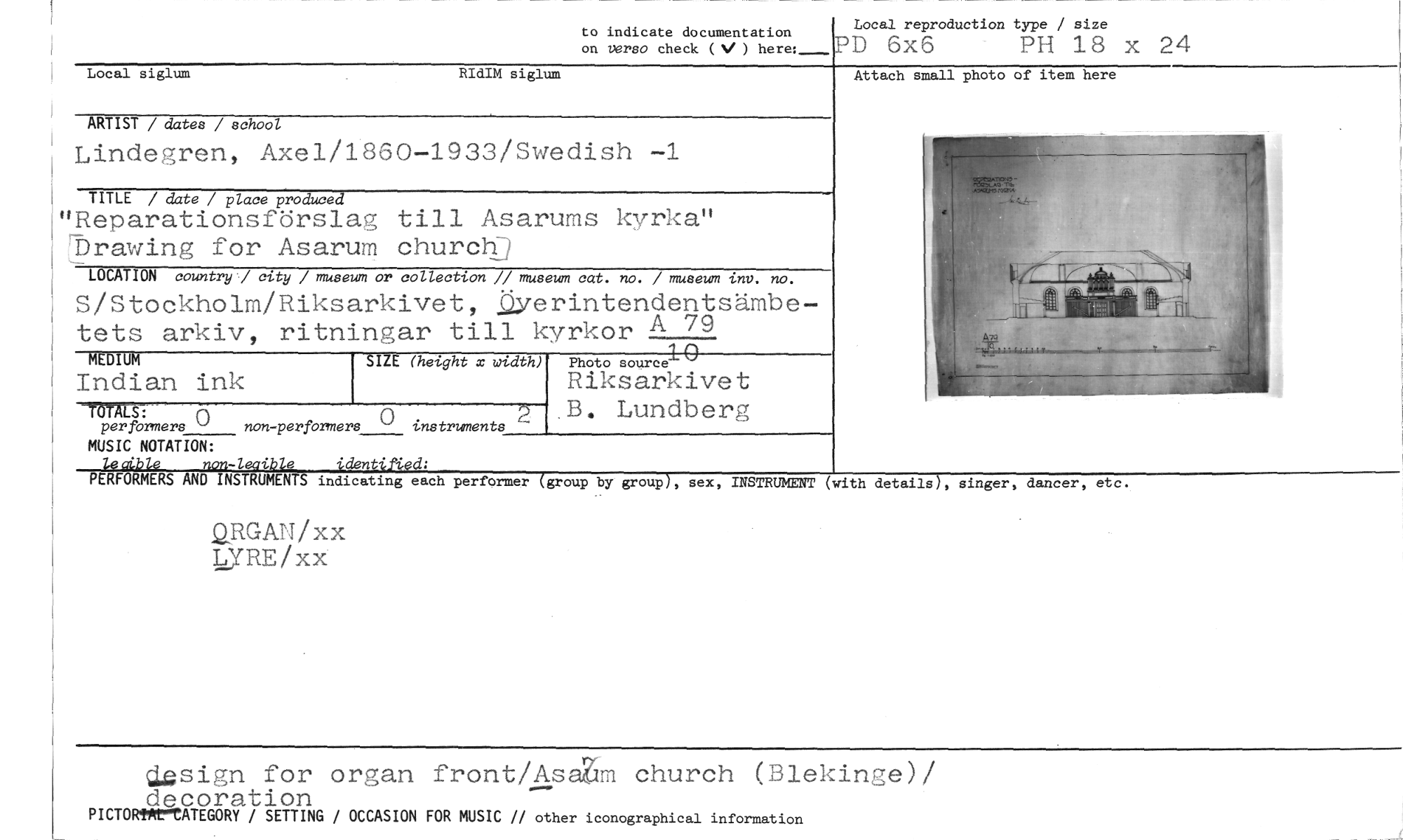 //// to indicate documentation on versa check ( V ) here: //// Local reproduction type / size //// FD 6x6 PH 18 x 24 //// ARTIST / dates / school //// Lindegren, Axel/1860-1933/Swedish -1 //// TITLE / date / place produced //// "Reparationsförslag till Asarums kyrka" 715rawing for Asarum church3 //// LOCATION countryj city / museum or collection // museum cat. no. / museum tnv. no. //// S/Stockholm/Riksarkivet, Dyerintendentsämbetets arkiv, ritningar till kyrkor Ill //// MEDIUM SIZE (height x width) Photo souree //// Indian ink Riksarkivet //// B. Lundberg //// -rams, //// perfbrmers non-performers (3 instruments '- //// MUSIC NOTATION: //// Attach small photo of item here //// Local siglum RIdIM siglum //// lecmhie non-leaible identffled: //// PERFORMERS AND INSTRUMENTS indicating each performer (group by group), sex, INSTRUMENT (with details), singer, dancer, etc. //// QRGAN/xx 6YRE/xx //// Usign for organ front/Asarbm church (Blekinge)/ decoration //// PICTOR~tATEGORY / SETTING / OCCASION FOR MUSIC // other iconographical information ////