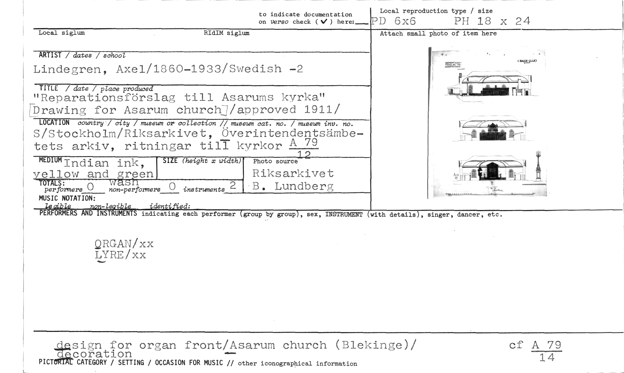 //// to indicate documentation //// on versa check (V ) here: //// Local reproduction type / size //// 21) 6x6 PH 18 x 24 //// Local siglum RIdIM siglum //// ARTIST / dates / school //// Lindegren, Axel/1860-1933/Swedish -2 //// TITLE / date / place produced //// "Reparationsförslag till Asarums kyrka" [Drawing for Asarum churchl/approved 1911/ //// LOCATION country / city / museum or collection // museum cat. no. / museum viv. no. //// S/Stockholm/Riksarkivet, Överintendentsämbetets arkiv, ritningar till kyrkor 122 //// momIndian ink, SIZE (height x width) Photo source-12 //// yellow and green To ms: r\ wash //// per formers non-performers instruments //// Riksarkivet //// B. Lundberg //// Attach small photo of item here //// MUSIC NOTATION: //// leaible non-leaible identified: //// PERFORMERS AND INSTRUMENTS indicating each performer (group by group), sex, INSTRUMENT //// QRGAN/xx LYRE/xx //// (with details), singer, dancer, etc. //// ksign for organ front/Asarum church (Blekinge)/ oration PICTWTAC CATEGORY / SETTING / OCCASION FOR MUSIC // other iconographical information cf A 79 //// 14 ////