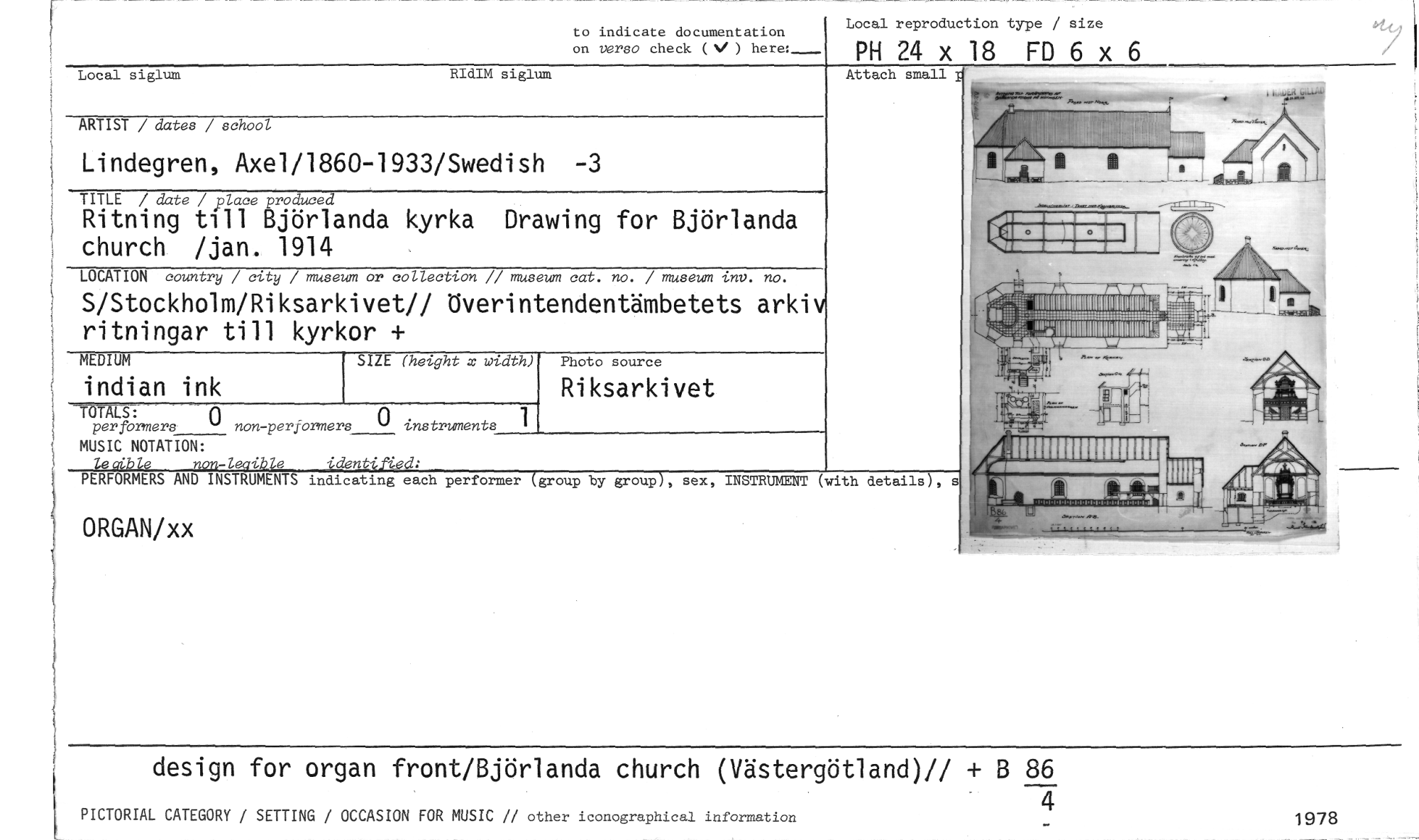 //// to indicate documentation Local reproduction type / size //// on verso check ) here: .-- //// PH 24 x 18 FD 6x //// Local siglum RIdIM siglum //// ARTIST / dates / school //// Lindegren, Axel/1860-1933/Swedish -3 //// TITLE / date / ,place produced //// Ritning till Björlanda kyrka Drawing for Björlanda church /jan. 1914 //// LOCATION country / city / museum or collection // museum cat. no. / museum unv. no. //// S/Stockholm/Riksarkivet// överintendentämbetets arkiv ritningar till kyrkor + //// SIZE (height x xudth) //// TÖTALS: //// per formers ° non-performers ° instruments //// J:dentifi_ed; //// indicating each performer (group by group), sex, INSTRUMENT (with details), s //// ORGAN/xx //// Attach small I //// MEDIUM //// indian ink //// MUSIC NOTATION: //// lecdble non-le-q-We //// PERFORMERS AND INSTRUMENTS //// Photo source //// Riksarkivet //// 1 //// e //// ,ligtwenammemmume //// ONNEMMUNIMUYI //// 4 :IIIIIIIIIIIIIIIIIIII //// design for organ front/Björlanda church (Västergötland)// + B 86 //// 4 //// PICTORIAL CATEGORY / SETTING / OCCASION FOR MUSIC // other iconographical information 1978 ////