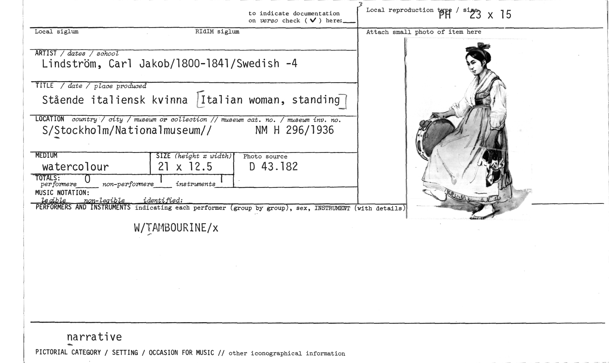 //// to indicate docunientation on verso check ) here: //// Local reproduction trift / si x 15 //// Local siglum RIdIM siglum //// Attach small photo of item here //// ARTIST / dates / school //// Lindström, Carl Jakob/1800-1841/Swedish -4 //// TITLE / date / place produced //// Stående italiensk kvinna fitalian woman, standind' //// LOCATION country / city / museum or collection // museum cat. no. / museum inv. no. //// S/Stockholm/Nationalmuseum// NM H 296/1936 //// MEDIUM //// watercolour //// LS: //// per formers non -perfårmers instruments //// MUSIC NOTATION: //// lecate non-leaible identified; //// PERFORMERS AND INSTRUMENTS indicating each performer (group by group), sex, INSTRUMENT (with details) //// W/TAMBOURINE/x //// SIZE (height x width) //// 21 x 12.5 //// Photo source //// D 43.182 //// narrative //// PICTORIAL CATEGORY / SETTING / OCCASION FOR MUSIC // other iconographical information ////