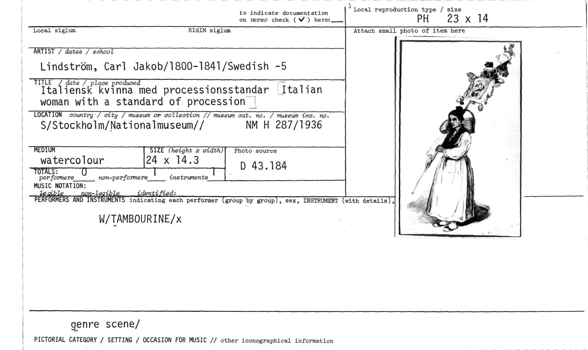 //// to indicate documentation 1 //// Local reproduction type / size //// on verso check (%, ) //// PH 23 x 14 //// Local siglum RIdIM siglum //// ARTIST / dates / school //// Lindström, Carl Jakob/1800-1841/Swedish -5 //// TITLE / date /kplace produced //// Italiens kvinna med processionsstandar Italian woman with a standard of procession //// LOCATION country / city / museum or collection // museum cat. no. / museum inv. no. //// S/Stockholm/Nationalmuseum// NM H 287/1936 //// MEDIUM //// watercolour //// TOTALS: //// per formers non-per formers I instruments //// MUSIC NOTATION: //// leaible non-leaible identified; //// PERFORMERS AND INSTRUMENTS indicating each performer (group by //// W/TAMBOURINE/x Attach small photo of item here //// SIZE (height x width) //// 24 x 14.3 //// Photo source //// D 43.184 //// group), sex, INSTRUMENT (with details), //// genre scene/ //// PICTORIAL CATEGORY / SETTING / OCCASION FOR MUSIC // other iconographical information ////