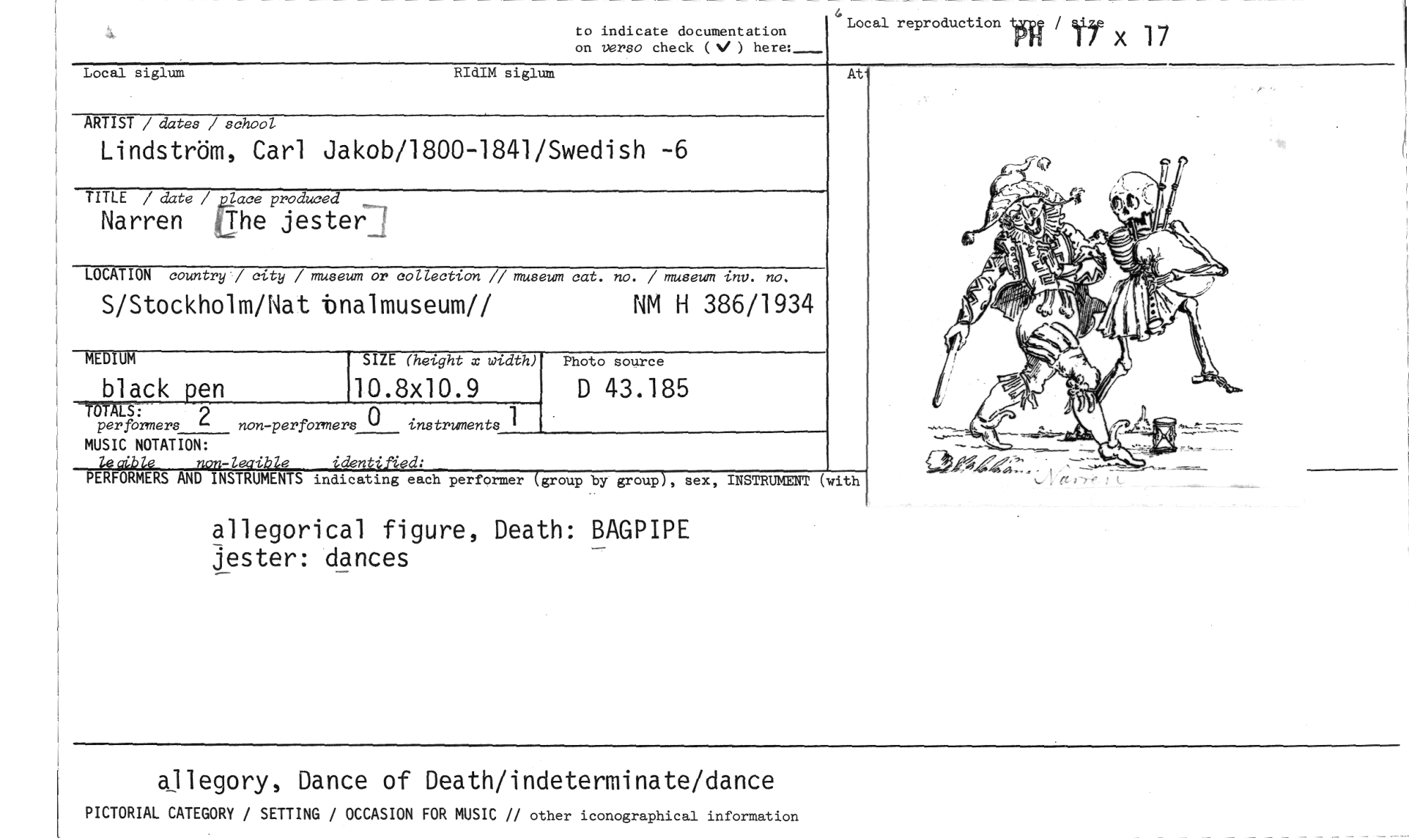 //// to indicate documentation Local reproduction 1,011 / abze x 17 //// on verso check (V ) here: //// Local siglum RIdIM siglum //// ARTIST / dates / school //// Lindström, Carl Jakob/1800-1841/Swedish -6 //// TITLE / date / lace produced //// Narren The jester //// LOCATION country / city / museum or collection // museum cat. no. / museum inv. no. //// S/Stockholm/Nat bnalmuseum// NM H 386/1934 //// MEDIUM //// black pen //// MUSIC NOTATION: //// 4e4ible non-leaitle identified: //// PERFORMERS AND INSTRUMENTS indicating each performer (group by group), sex, //// MALS: //// per formers 9 " non-performers 13 instruments 1 //// SIZE (height x width) //// 10.8x10.9 //// Photo source //// D 43.185 //// A //// INSTRUMENT (with //// allegorical figure, Death: BAGPIPE jester: dances //// allegory, Dance of Death/indeterminate/dance //// PICTORIAL CATEGORY / SETTING / OCCASION FOR MUSIC // other iconographical information ////